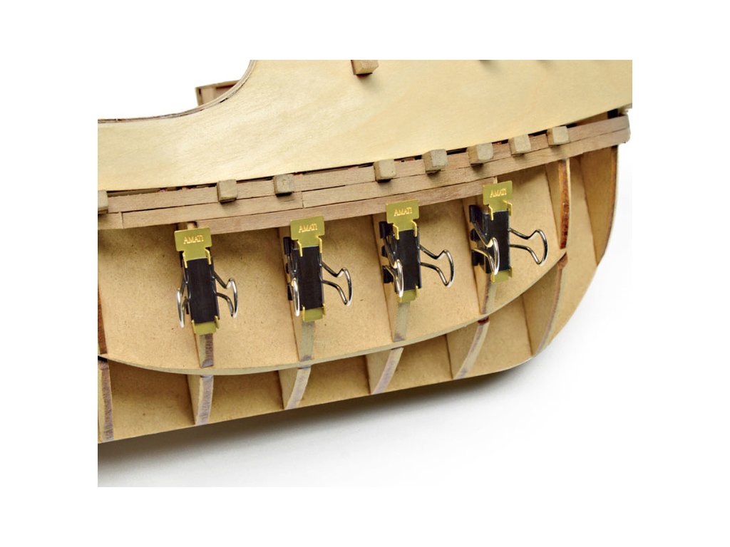 Praktická sada 12 svorek s držáky usnadňující plaňkování trupů dřevěných modelů lodí. Svěrky umožňují bezpečné a přesné přichycení lišty ke každému žebru během lepení.
