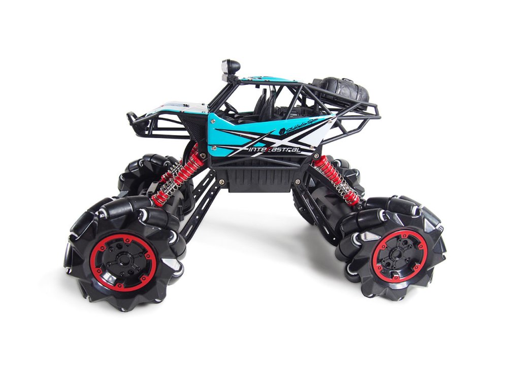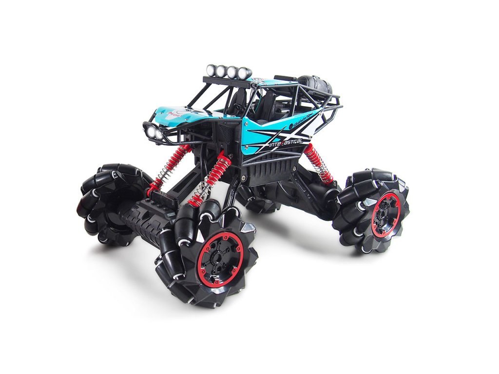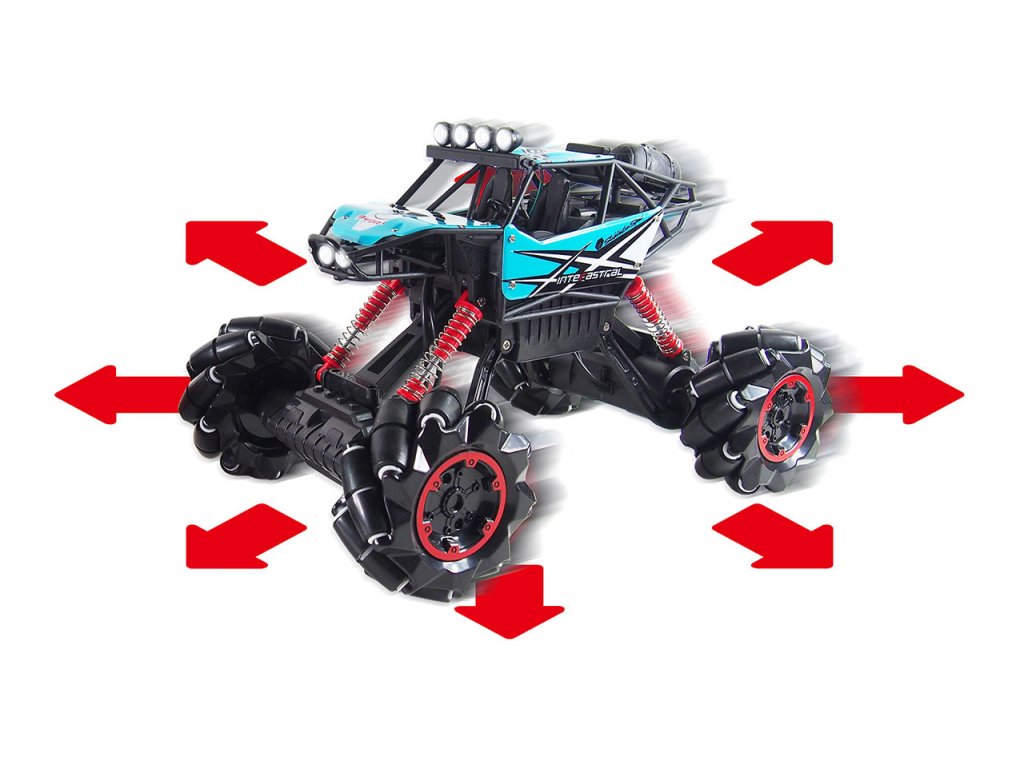 Drift Climbing King přináší do našeho sortimentu RC hraček nový vítr. Má zcela nový pohonný systém. Obvykle je auto vybaveno řídící nápravou, ale Drift Climbing King místo toho používá kola, která jsou opatřena 9 samostatnými válečky. Každé kolo je poháněno odděleně, což umožňuje vozidlu pohybovat se v libovolném směru. 2,4 GHz dálkové ovládání má 17 akčních tlačítek.