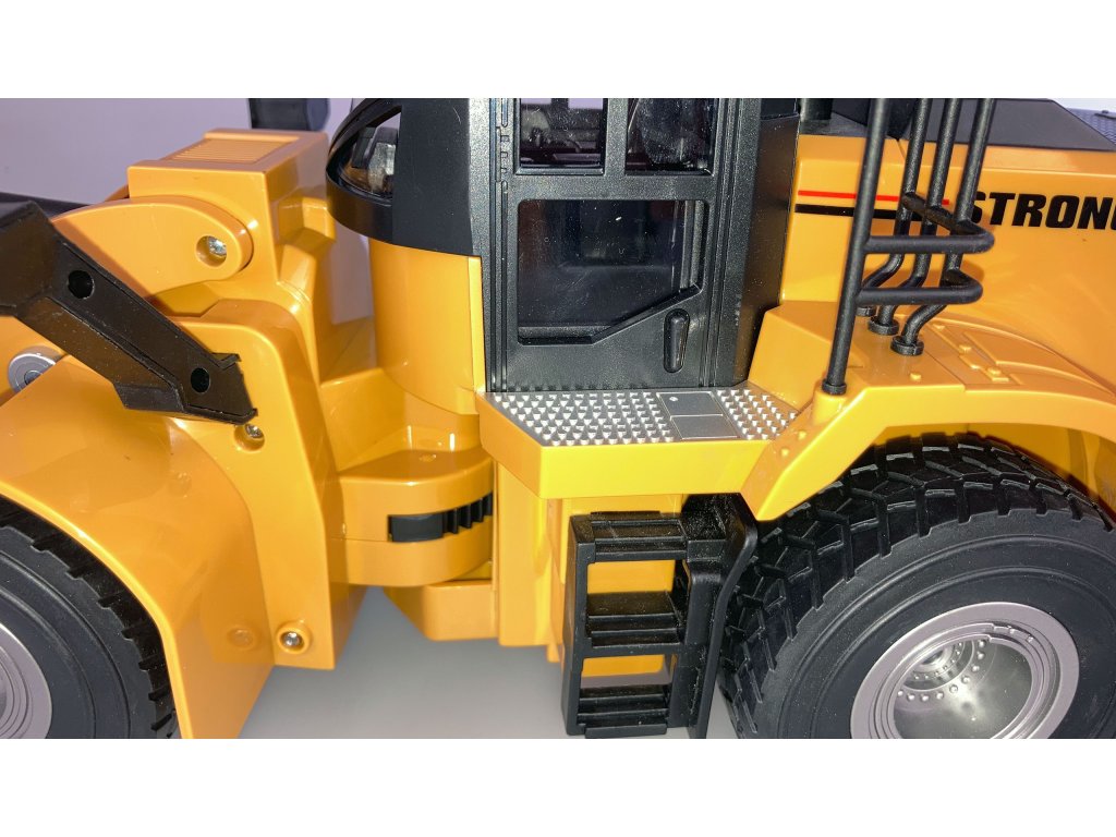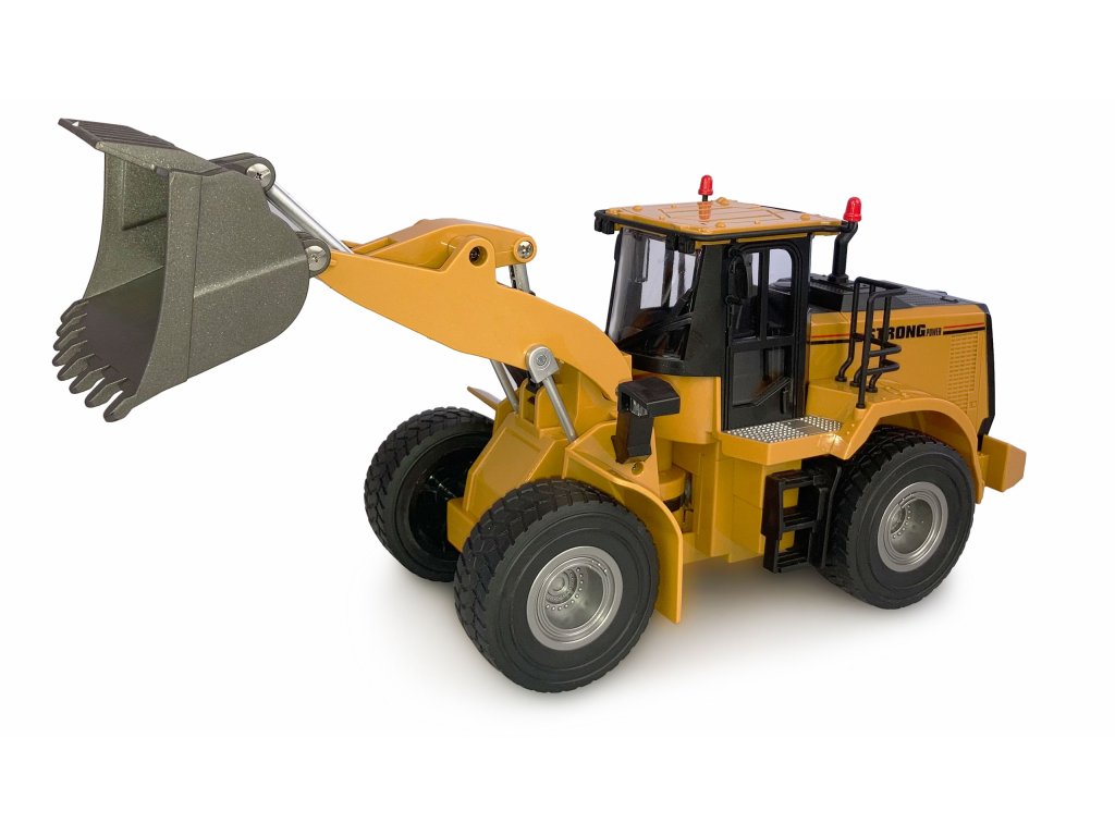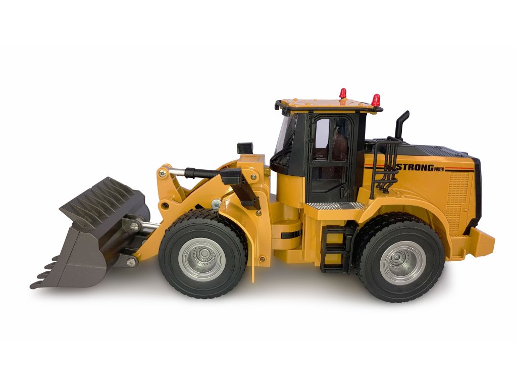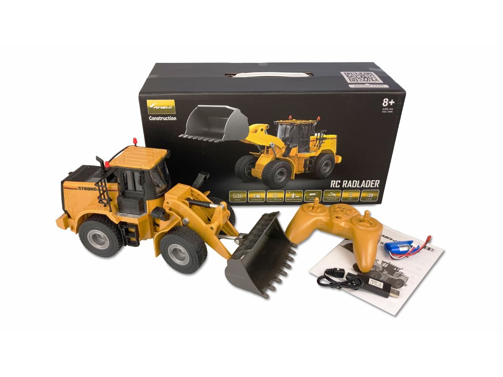 Malý RC kolový nakladač v měřítku 1:24 se všemi běžnými funkcemi jako je vpřed/vzad, vpravo/vlevo, zdvih/dolů lžíce – také zvuk a světlo lze spínat pomocí vysílače (zapnout/vypnout). Model má pohon zadních kol 2WD s výkonným elektromotorem a rychlým kloubovým řízením, které umožňuje kolovému nakladači otáčet se uprostřed doprava a doleva a měnit směr jízdy. Hlavní rameno s lžící poskytuje dostatečný výkon i pro těžší zatížení. S gumovými pneumatikami pro optimální pohon v terénu a konstrukcí odolnou proti stříkající vodě je toto vozidlo plně vhodné pro venkovní použití. Rozsah dodávky již zahrnuje vše potřebné pro provoz modelu – v balení nejsou pouze baterie pro dálkové ovládání 2,4GHz (2x 1,5V AA baterie). Přiložená 7.4V 600mAh Li-Ion baterie s BEC konektorem lze nabíjet v krátkém čase pomocí dodaného nabíjecího kabelu USB. Díky univerzální vestavěné připojovací zástrčce (JST–BEC) se do modelu vejde i řada dalších baterií. Kolový nakladač, dodávaný ve vysoce kvalitním přepravním boxu s krásným potiskem a polystyrenovou vložkou.