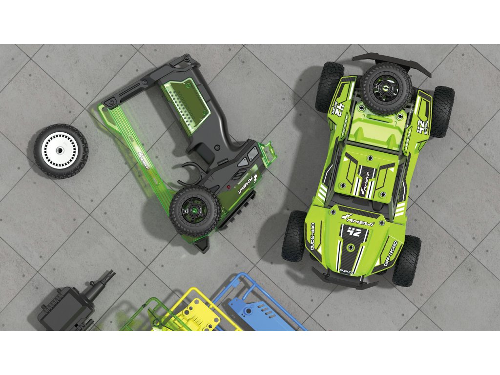 V RC STAVEBNICI COOLRC DIY naleznete skvělý závodní vůz s pohonem zadní nápravy 2WD v měřítku 1:18, který kombinuje zábavu ze stavby a poté rychlé jízdy. Díky inteligentnímu zásuvnému systému lze model s více než 70 kusy smontovat zcela bez použití nářadí do 30 minut a dokonce bez lepidla. Celé tělo je vyrobeno z pevného ABS plastu. Samolepky odolné vůči UV záření s trendy COOL vzory dodávají závodníkovi v případě potřeby osobitější vzhled. S pneumatikami vyrobenými z gumové směsi s vysokou přilnavostí, tlumiči nárazů a ochranou proti stříkající vodě je model vhodný i pro venkovní použití. Model dosahuje maximální rychlosti cca 8 km/h. Moderní 2,4GHz pistolové dálkové ovládání je již součástí dodávky. Pro uvedení modelu do provozu jsou vyžadovány pouze standardní domácí baterie pro model a dálkové ovládání.