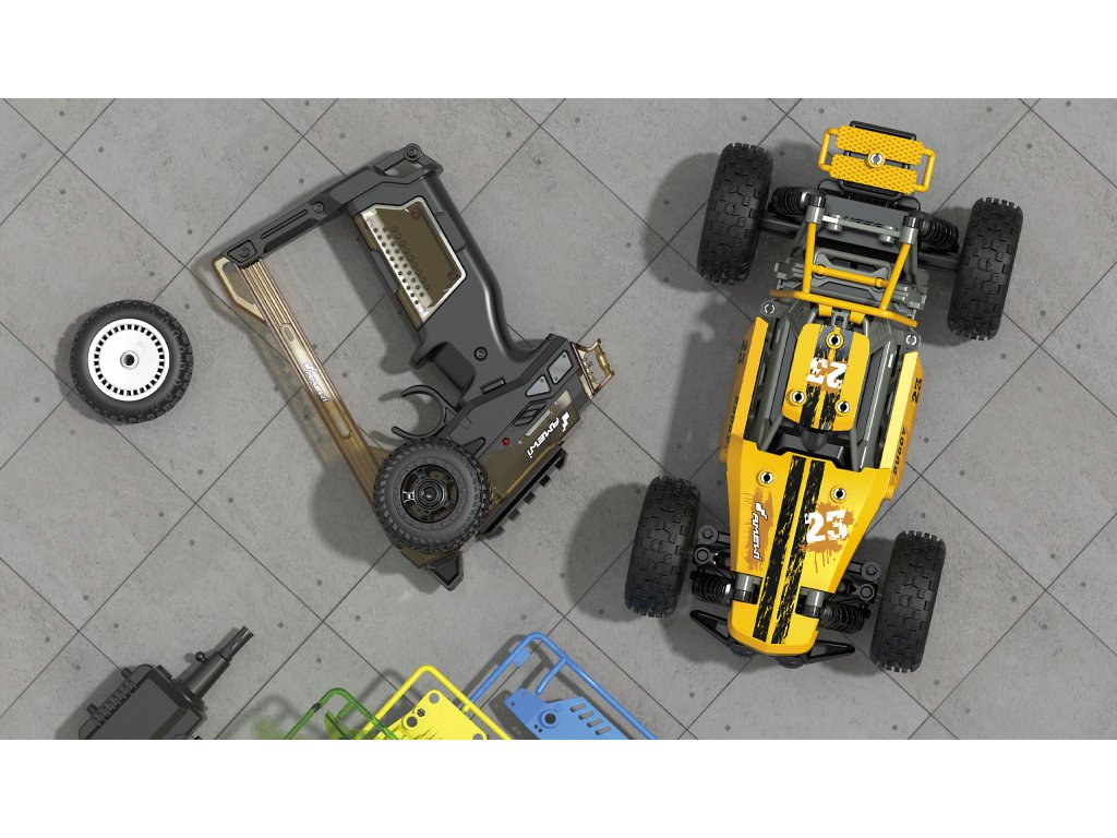 V RC STAVEBNICI COOLRC DIY naleznete skvělý závodní vůz s pohonem zadní nápravy 2WD v měřítku 1:18, který kombinuje zábavu ze stavby a poté rychlé jízdy. Díky inteligentnímu zásuvnému systému lze model s více než 60 kusy smontovat zcela bez použití nářadí do 30 minut a dokonce bez lepidla. Celé tělo je vyrobeno z pevného ABS plastu. Samolepky odolné vůči UV záření s trendy COOL vzory dodávají závodníkovi v případě potřeby osobitější vzhled. S pneumatikami vyrobenými z gumové směsi s vysokou přilnavostí, tlumiči nárazů a ochranou proti stříkající vodě je model vhodný i pro venkovní použití. Model dosahuje maximální rychlosti cca 8 km/h. Moderní 2,4GHz pistolové dálkové ovládání je již součástí dodávky. Pro uvedení modelu do provozu jsou vyžadovány pouze standardní domácí baterie pro model a dálkové ovládání.