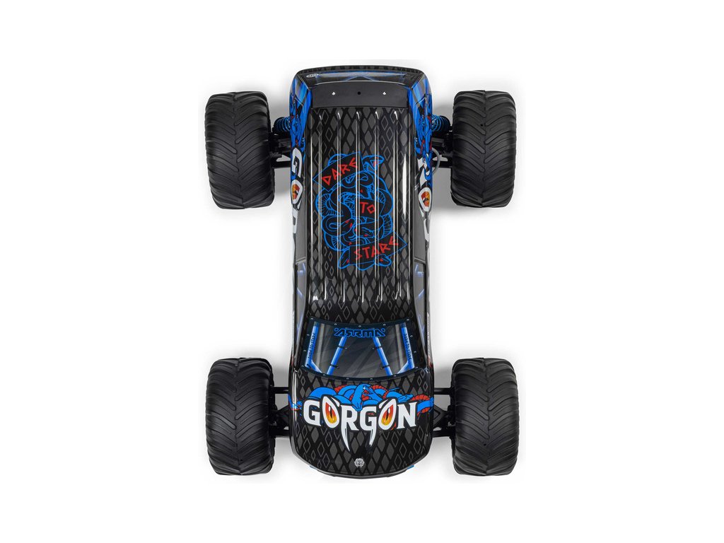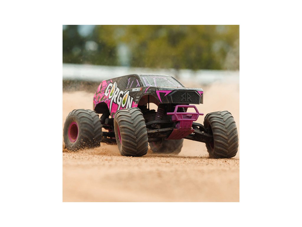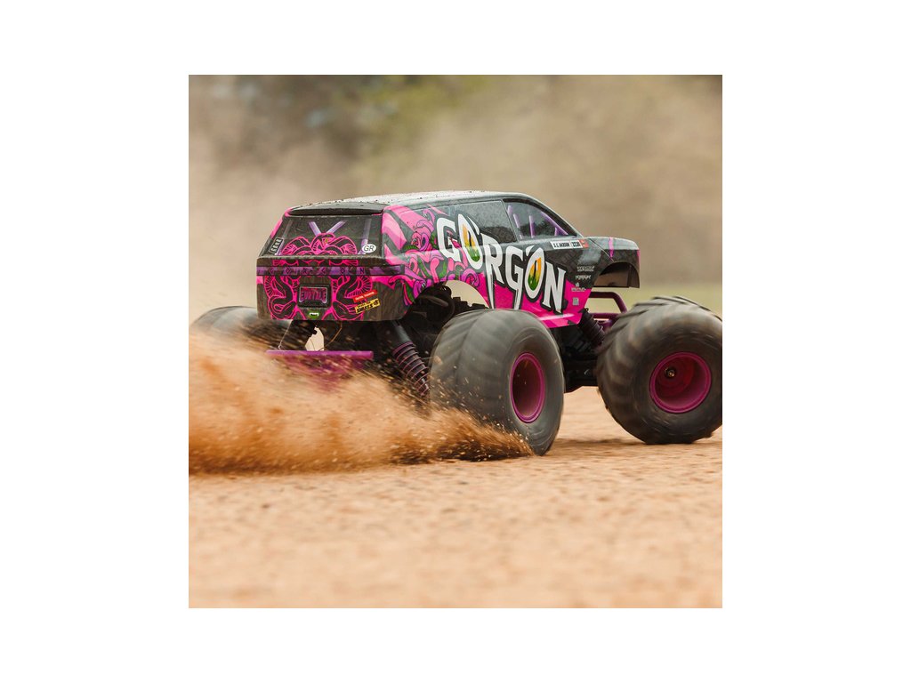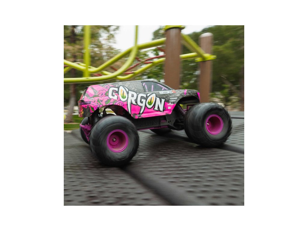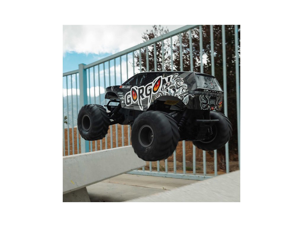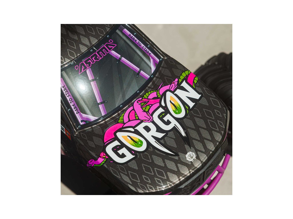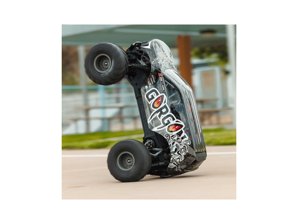 Ihned po vybalení přitáhne Gorgon vaši pozornost díky svému originálnímu vzhledu. Karoserie je z výroby dokončena ve velmi atraktivním moderním stylu a je barevně sladěna s jednotlivými díly šasi, jako jsou pružiny, přihrádka na baterii, kluzné desky a nárazníky. Osvědčená technologie ARRMA má díky kompozitnímu šasi vysokou odolnost. Nezávislé zavěšení, olejové tlumiče a nastavitelná světlá výška zajišťují komfortní jízdu. Pro nezastavitelnou trakci přenáší 2WD převodovka výkon ze stejnosměrného motoru MEGA 550 do masivních pneumatik dBoots ® Chevron o rozměru 130mm, nalepených na nylonových discích 57mm. Použité kovové převody jsou dostatečně odolné i pro případný upgrade na střídavý pohon.