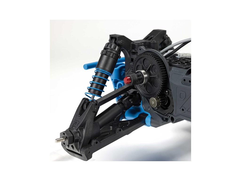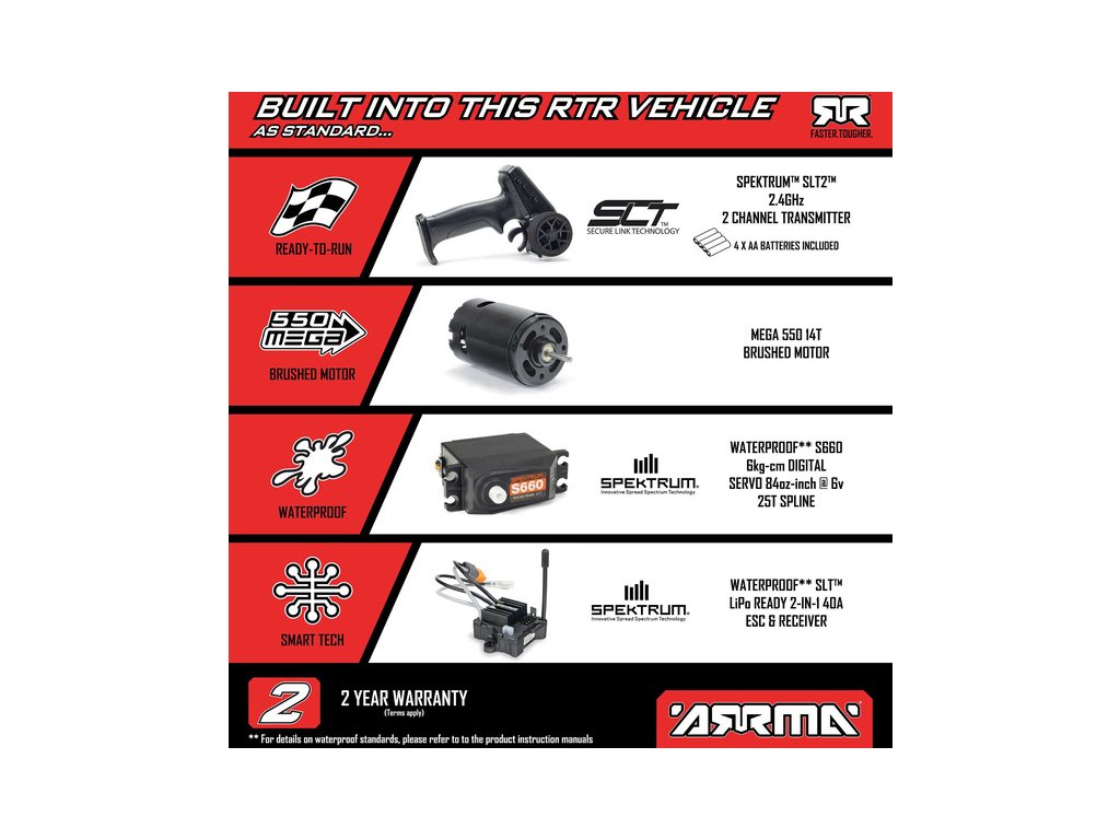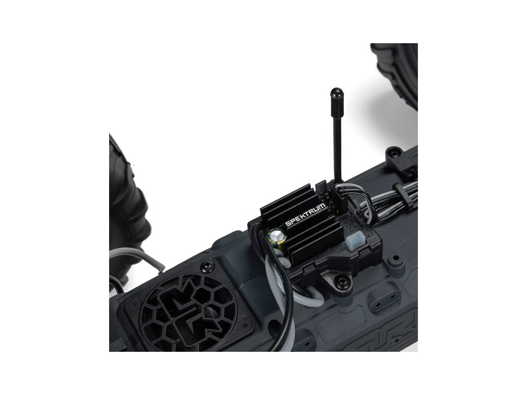 Vysílač Spektrum SLT poskytuje bezpečný provoz bez výpadků a pro začátečníky umožňuje možnost omezení výkonu na 75%, nebo 50%. Pro bezstarostnou jízdu jsou na modelu použity voděodolné* komponenty - regulátor s přijímače Spektrum 2-v-1 25A a servo řízení Spektrum S660 s vysokým točivým momentem.