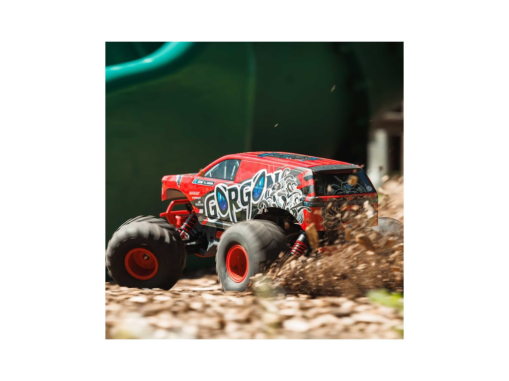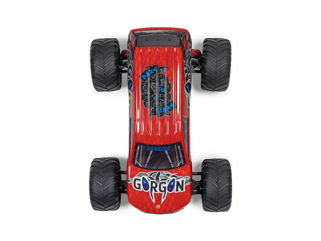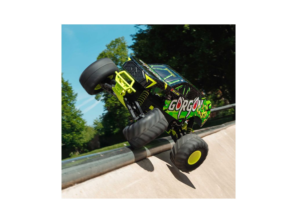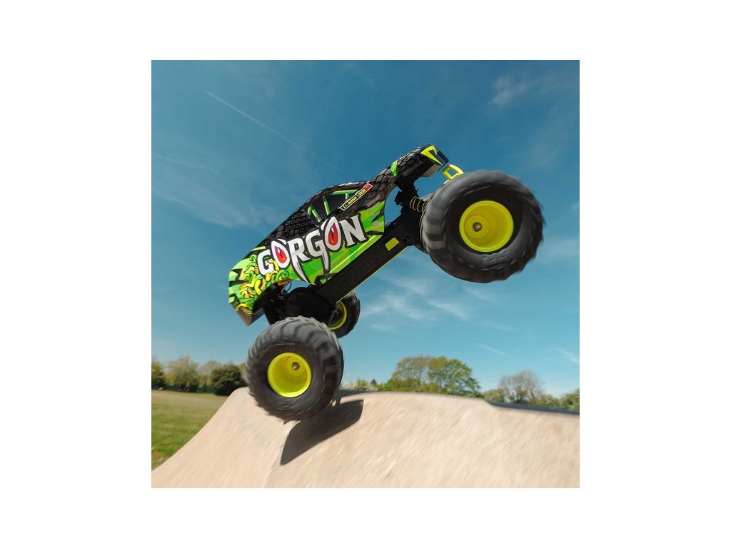 Ihned po vybalení přitáhne Gorgon vaši pozornost díky svému originálnímu vzhledu. Karoserie je z výroby dokončena ve velmi atraktivním moderním stylu a je barevně sladěna s jednotlivými díly šasi, jako jsou pružiny, přihrádka na baterii, kluzné desky a nárazníky. Osvědčená technologie ARRMA má díky kompozitnímu šasi vysokou odolnost. Nezávislé zavěšení, olejové tlumiče a nastavitelná světlá výška zajišťují komfortní jízdu. Pro nezastavitelnou trakci přenáší 2WD převodovka výkon ze stejnosměrného motoru MEGA 550 do masivních pneumatik dBoots ® Chevron o rozměru 130mm, nalepených na nylonových discích 57mm. Použité kovové převody jsou dostatečně odolné i pro případný upgrade na střídavý pohon.