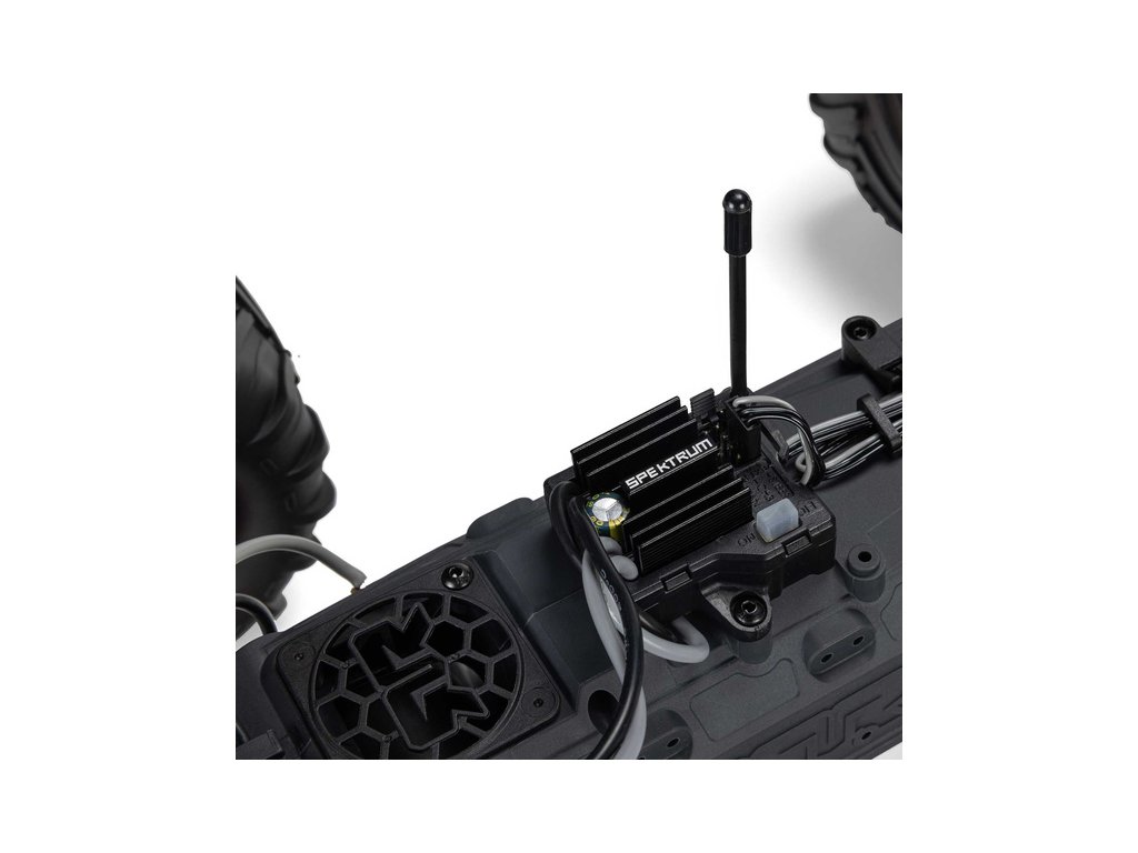 Vysílač Spektrum SLT poskytuje bezpečný provoz bez výpadků a pro začátečníky umožňuje možnost omezení výkonu na 75%, nebo 50%. Pro bezstarostnou jízdu jsou na modelu použity voděodolné* komponenty - regulátor s přijímače Spektrum 2-v-1 25A a servo řízení Spektrum S660 s vysokým točivým momentem.