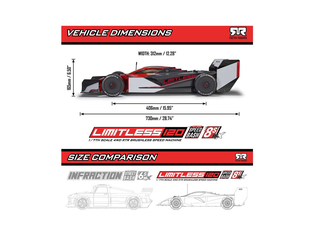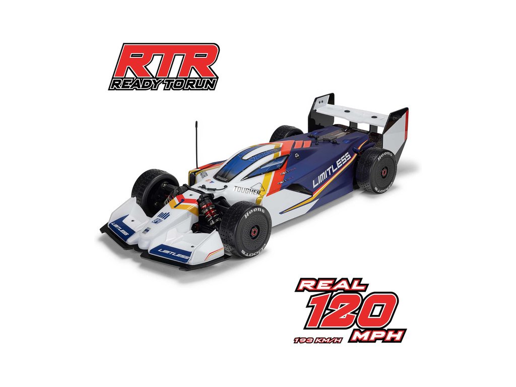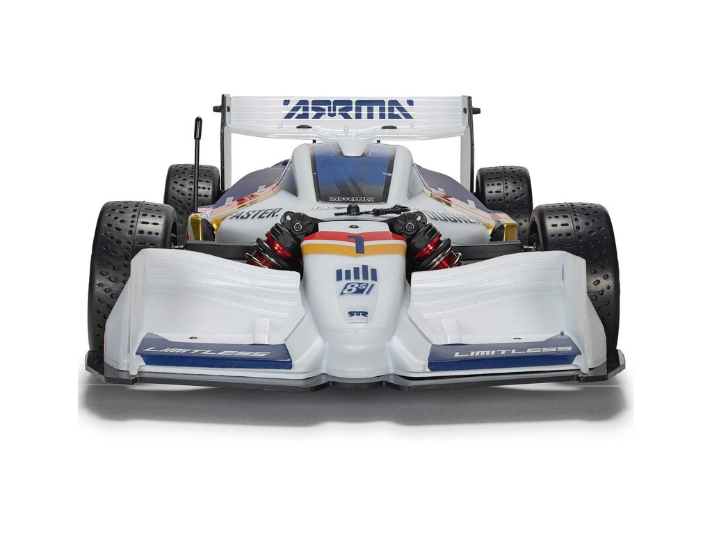 Nový král rychlosti a nejrychlejší sériově vyráběný RC model auta, to je Arrma Limitless 8S BLX 1:7. Tento silniční speciál v atraktivním designu formule je určen pro zkušené řidiče, kteří s ním můžou posouvat hranice výkonu a rychlosti. Model je vybaven vším co potřebujete k ovládnutí asfaltu a dosáhne rychlosti až 110 km/h. Chcete víc? Instalujte v balení obsažený rychlostní pastorek pro rychlost až 160 km/h. A pokud ještě instalujete pevné čelní ozubené kolo místo středového diferenciálu a obsažené aerodynamické prvky můžete překonat i rychlosti 190 km/h. Model lze provozovat na 6S nebo 8S LiPo akumulátory (prodávají se samostatně), dle toho jestli chcete běžnou jízdu nebo rychlostní sprint.