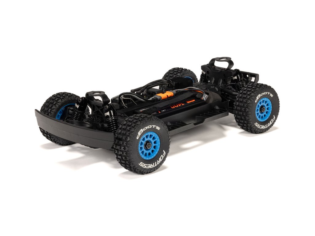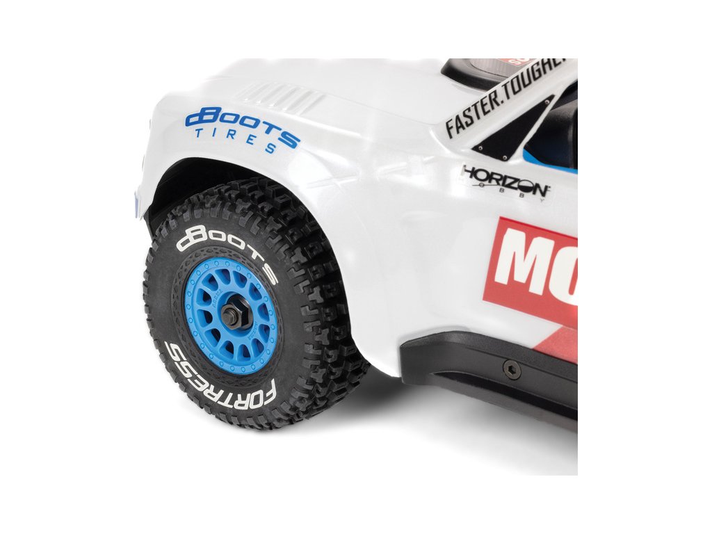 Auto je pro náročnou jízdu skvěle připraveno, obsahuje silné kompozitní šasi s nezávislým zavěšením, olejovými tlumiči a náhonem 4WD. Robustní kovové převody diferenciálů přenáší výkon ze střídavého motoru přes uzavřené hnací ústrojí až na kola a pneumatiky dBoots Fortress. Dokonce i servo řízení Spektrum™ SX110 má kovové převody a stejně jako řídící jednotka 2-v-1 25A, vybavená konektorem IC2®, je voděodolné* pro jízdu v mokrém prostředí. Integrovaný vysokorychlostní chladicí ventilátor udržuje nízké teploty motoru a regulátoru pro dlouhou životnost a špičkový výkon.