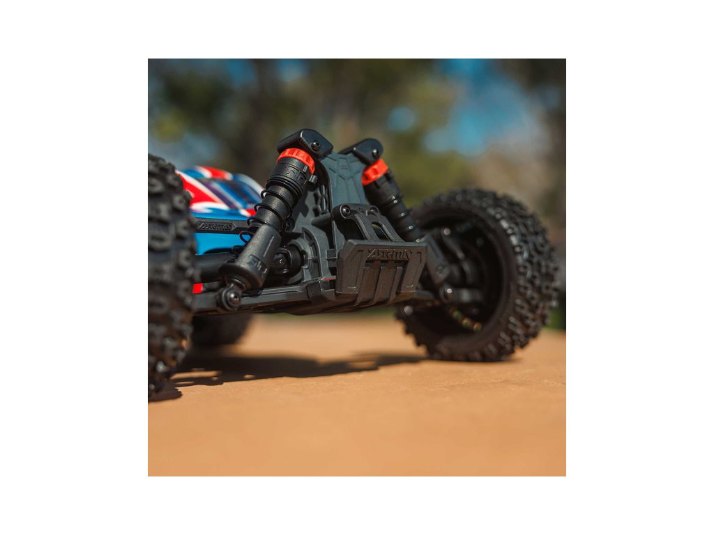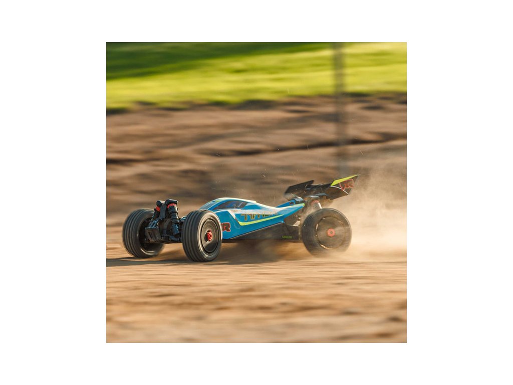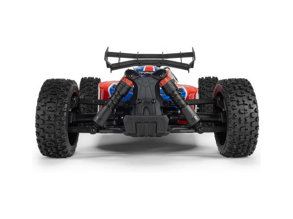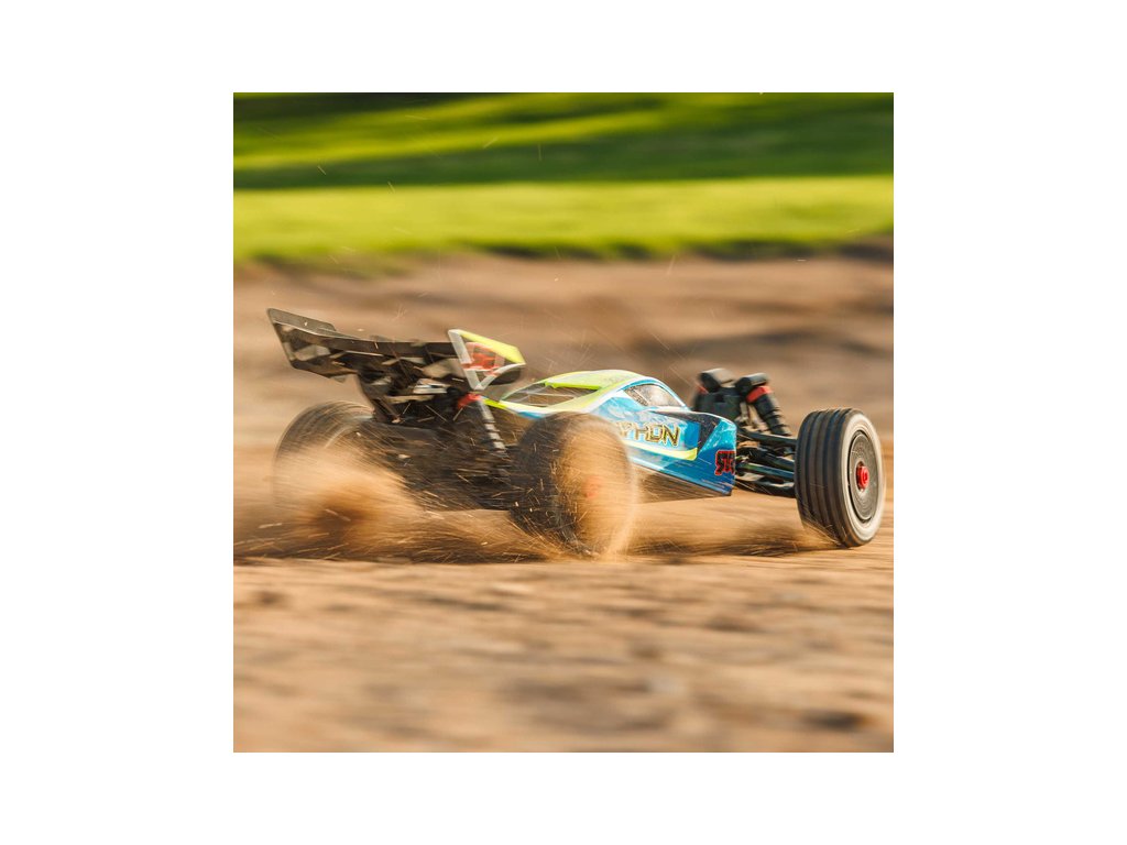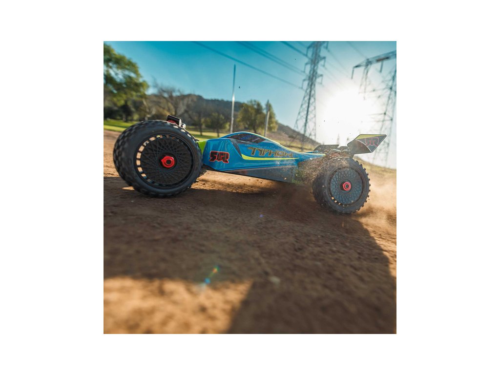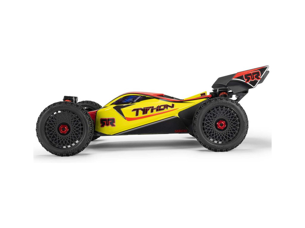 RC model buggy Arrma Typhon Mega v měřítku 1:8 s pohonem 4x4, ideální pro děti a začátečníky, který nabízí extra výkon ihned po vybalení, díky o 11% většímu stejnosměrnému motoru 665 (High Speed). Dosahuje rychlosti až 32 km/h. Odolné šasi s kluznými deskami a zvýšenými bočnicemi proti vnikání nečistot. Robustní diferenciály s kovovými převody. Olejové tlumiče. Bezsponková karoserie pro snadnou výměnu akumulátoru. RC souprava Spektrum SLT2.