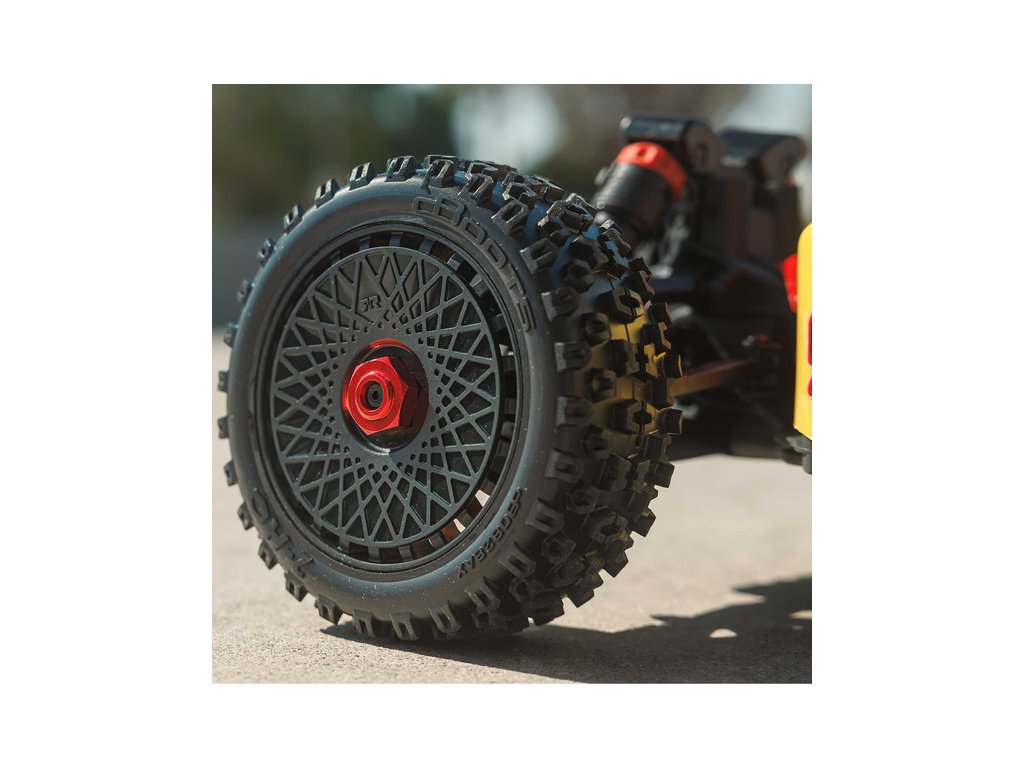 RC model buggy Arrma Typhon Mega v měřítku 1:8 s pohonem 4x4, ideální pro děti a začátečníky, který nabízí extra výkon ihned po vybalení, díky o 11% většímu stejnosměrnému motoru 665 (High Speed). Dosahuje rychlosti až 32 km/h. Odolné šasi s kluznými deskami a zvýšenými bočnicemi proti vnikání nečistot. Robustní diferenciály s kovovými převody. Olejové tlumiče. Bezsponková karoserie pro snadnou výměnu akumulátoru. RC souprava Spektrum SLT2.