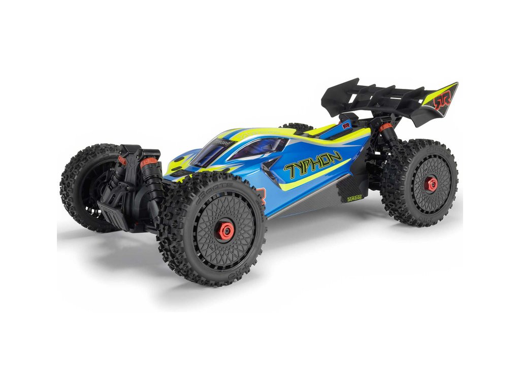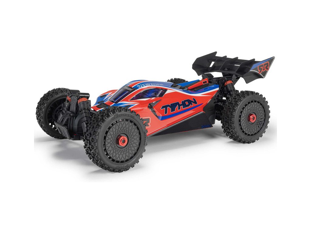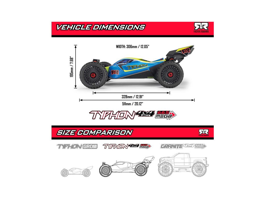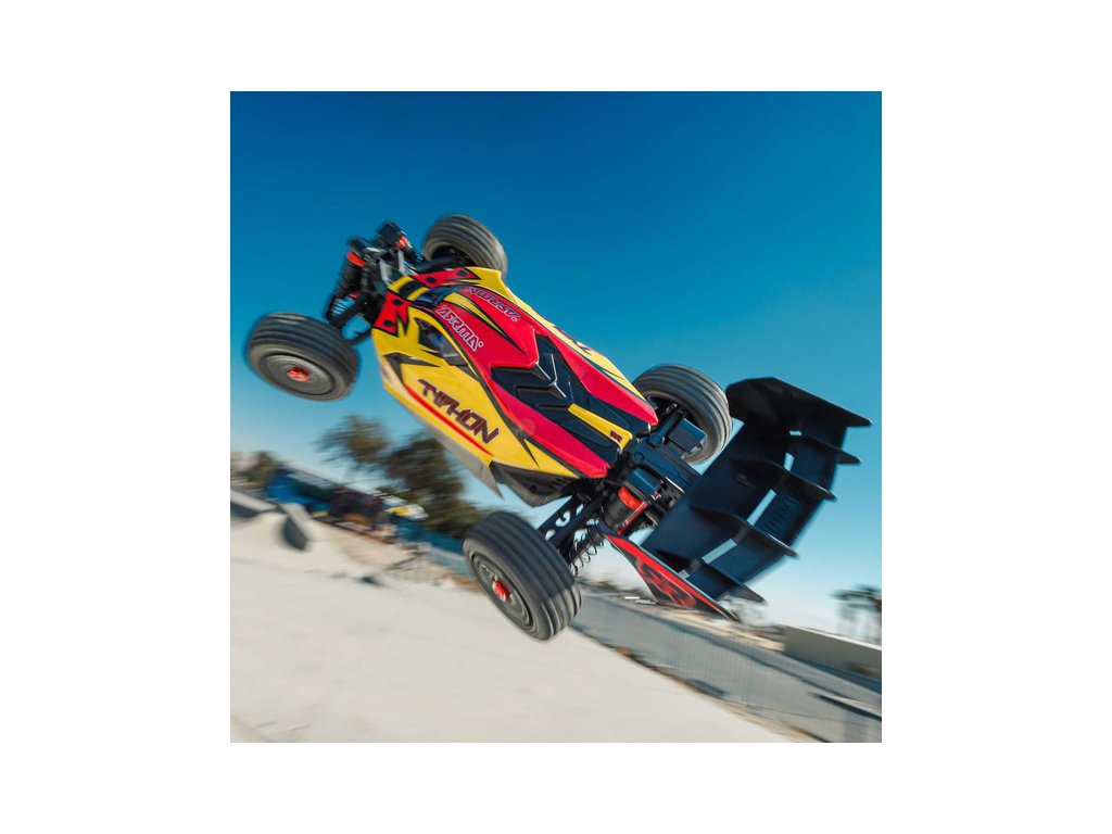 RC model buggy Arrma Typhon Mega v měřítku 1:8 s pohonem 4x4, ideální pro děti a začátečníky, který nabízí extra výkon ihned po vybalení, díky o 11% většímu stejnosměrnému motoru 665 (High Speed). Dosahuje rychlosti až 32 km/h. Odolné šasi s kluznými deskami a zvýšenými bočnicemi proti vnikání nečistot. Robustní diferenciály s kovovými převody. Olejové tlumiče. Bezsponková karoserie pro snadnou výměnu akumulátoru. RC souprava Spektrum SLT2.