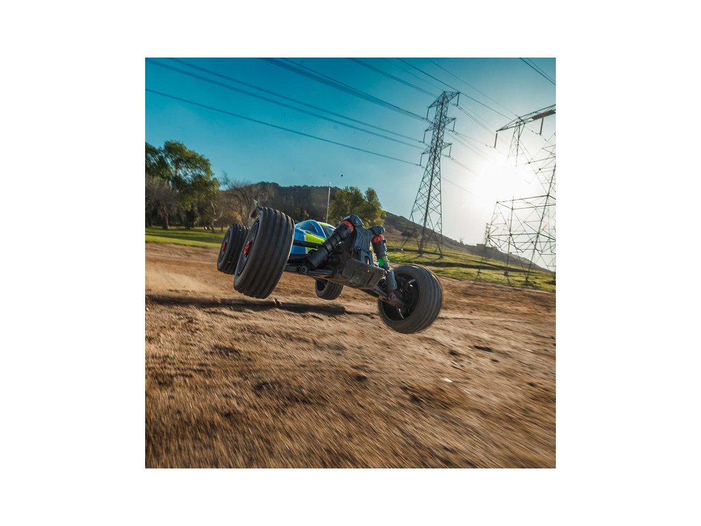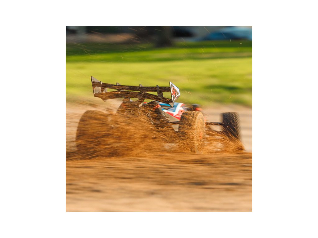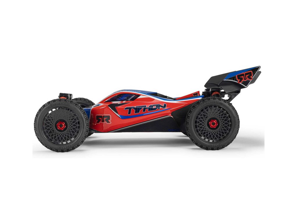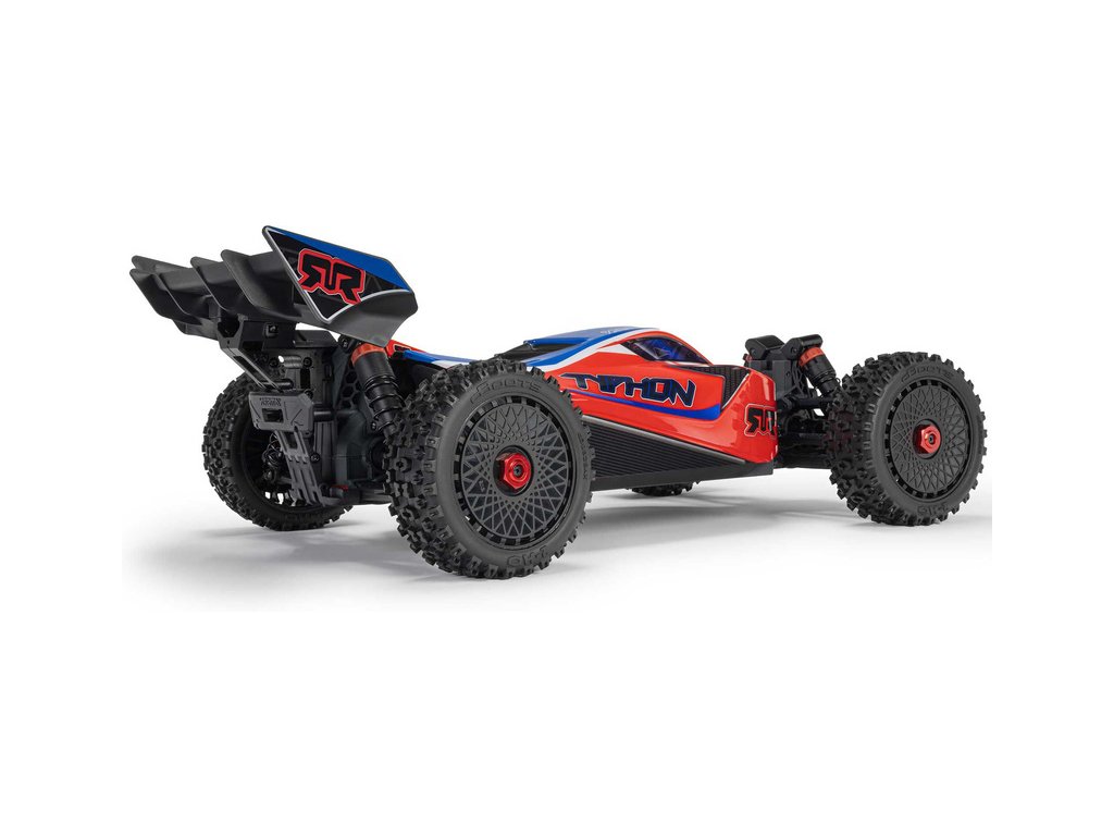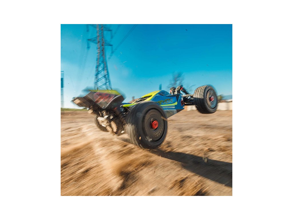 RC model buggy Arrma Typhon Mega v měřítku 1:8 s pohonem 4x4, ideální pro děti a začátečníky, který nabízí extra výkon ihned po vybalení, díky o 11% většímu stejnosměrnému motoru 665 (High Speed). Dosahuje rychlosti až 32 km/h. Odolné šasi s kluznými deskami a zvýšenými bočnicemi proti vnikání nečistot. Robustní diferenciály s kovovými převody. Olejové tlumiče. Bezsponková karoserie pro snadnou výměnu akumulátoru. RC souprava Spektrum SLT2.