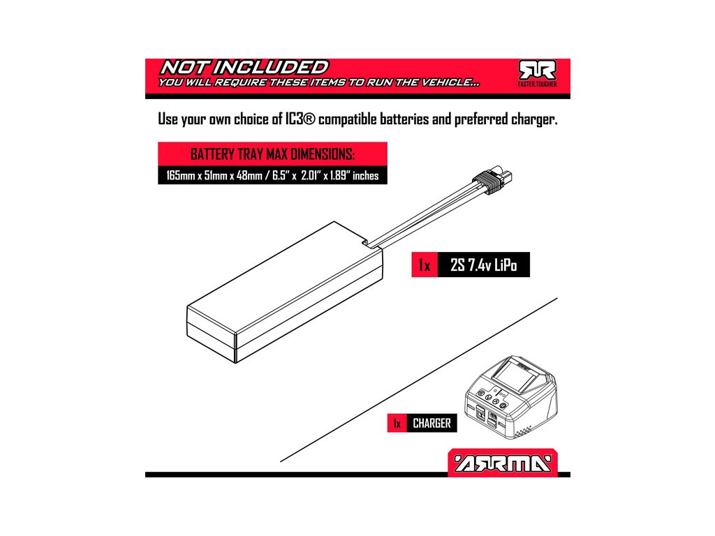 Karoserie je hotová nabarvená a využívá bezsponkový systém upevnění na šasi pro snadnou výměnu akumulátoru a přístup k elektronice. Model je vybaven kvalitní řídicí jednotkou Spektrum 2v1 s integrovaným regulátorem a přijímačem. Na jednotce lze snadno nastavit typ akumulátoru pomocí zkratovací propojky. Jednotka dále obsahuje port pro možnost zapojení externího přijímače. Velký motor 665 nově obsahuje hliníkový chladič s 35 mm ventilátorem pro udržení vhodné provozní teploty za všech okolností. Stačí doplnit akumulátor a nabíječku (prodávají se samostatně), poté můžete vyrazit se svým ARRMA TYPHON MEGA 665 4x4 na zahradu, do terénu nebo na nízkou trávu a užít si jízdu.