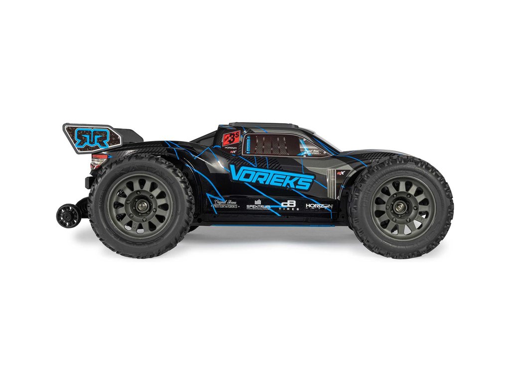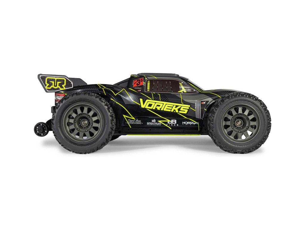 Vorteks má klasickou konstrukci oblíbených modelů typu truggy, což mu umožňuje uhánět téměř v jakémkoli prostředí – v terénu, na trávě, na parkovištích i asfaltovém povrchu. Jeho široký postoj zlepšuje ovladatelnost při vysokých rychlostech. Kompozitní šasi odolá i tvrdým nárazům. Použité kovové převody jsou dostatečně odolné pro střídavý pohon. Maximální trakci zajišťují osvědčené pneumatiky dBoots Dirtrunner vpředu a dBoots Katar vzadu. Vysílač Spektrum SLT poskytuje bezpečný provoz bez výpadků, pro bezstarostnou jízdu jsou na modelu použity voděodolné* komponenty - regulátor s přijímače Spektrum 2-v-1 45A a servo řízení Spektrum S681 s vysokým točivým momentem.