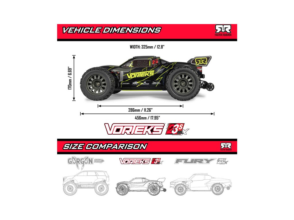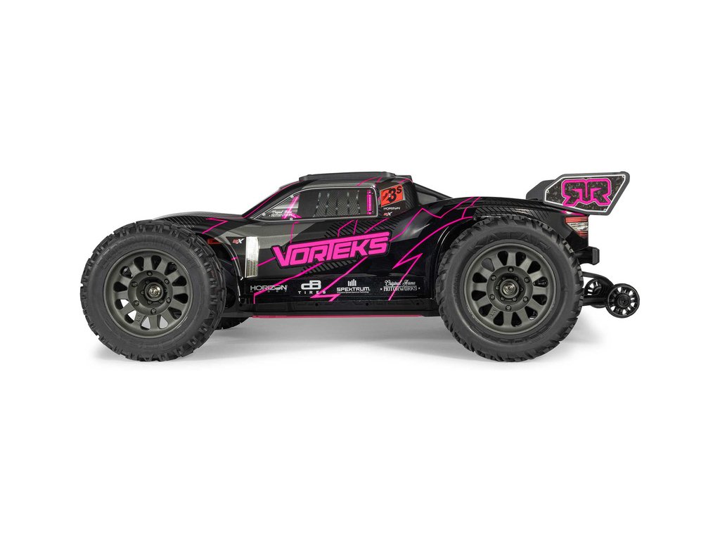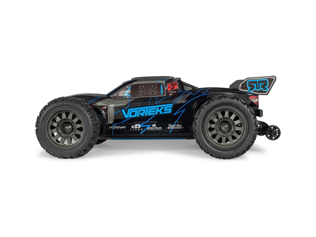 RC model auta Arrma Vorteks 223S BLX typu truggy s náhonem 2WD, nezávislým zavěšením, olejovými tlumiči a výkonným střídavým pohonem, dosáhne rychlosti až 80 km/h. To vše za dostupnou cenu pro takto výkonný model. Odolnost, výkon BLX a precizní maketové zpracování jsou vlastní značce Arrma a i tohoto modelu jsou zachovány všechny důležité vlastnosti. Obsažena je exkluzivní stabilizace jízdy DSC. RC auto je určeno pro děti, dospělé, začátečníky i zkušené jezdce, kteří získají hotový, odolný a rychlý model.