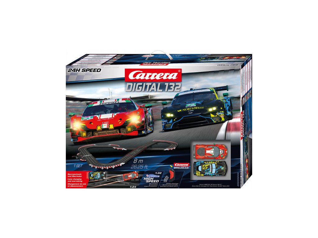 Autodráha Carrera Digital 132 dlouhá 8m s auty BMW M4 GT3 a Aston Martin Vantage GT3 obsahuje rovinky, zatáčky, bezdrátové ovladače, přemostění, díl na předjíždění zleva a zprava, napájecí díl a další díly.Délka trati: 8m