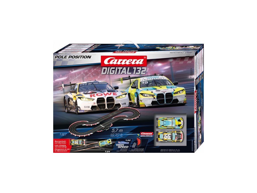 Autodráha Carrera Digital 132 dlouhá 5,7m s auty BMW M4 GT3 obsahuje rovinky, zatáčky, bezdrátové ovladače, díl na předjíždění zleva a zprava, napájecí díl a další díly.Délka trati: 5,7m