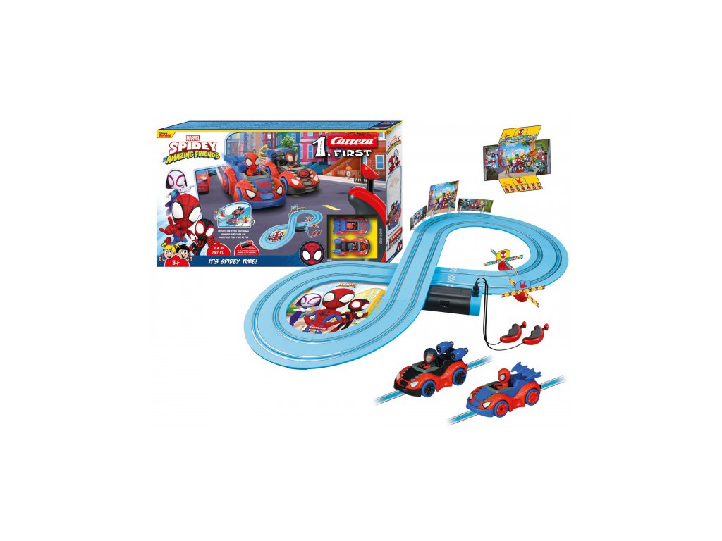 Mladý Peter Parker (zkráceně Spidey) je již oblíbeným superhrdinou, ale v dětském seriálu „Spidey a jeho super přátelé“ si rychle uvědomí, že je ještě jednodušší pomáhat lidem s přáteli po vašem boku. V setu Carrera FIRST ‚It’s Spidey Time‘ se k němu při závodě na trati dlouhé 2,4 metru připojí jeho kamarád Miles Morales, alias Spin. Děti ve věku od 3 let závodí na bateriové dráze vybavené vrtulemi – pro ještě více zábavy. Dráhu zdobí četné dekorativní prvky, které vytvářejí skutečnou atmosféru Spidey ve vašem pokoji.