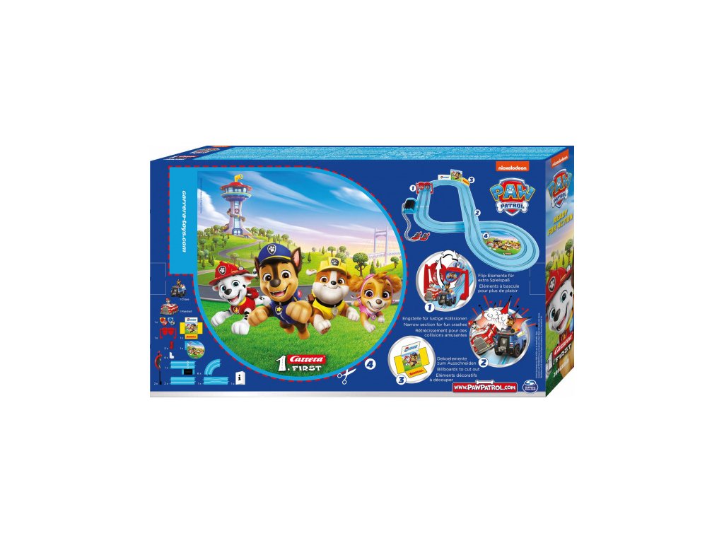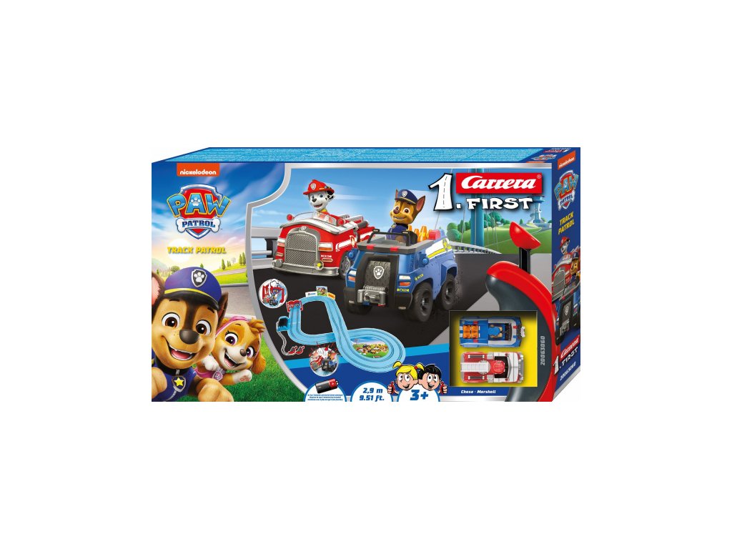 Autodráha Carrera FIRST dlouhá 2,9m s auty Tlapková Patrola Chase a Marshall, pro děti od 3 let, na baterie, obsahuje rovinky, zatáčky, bránu pro větší zábavu při jízdě, ovladače a dekorace s tématikou Tlapková Patrola.