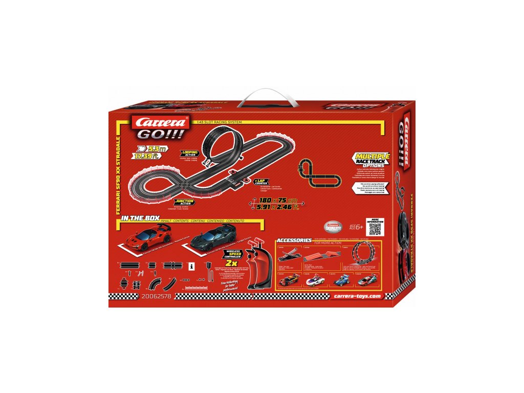 Autodráha Carrera GO!!! dlouhá 5,3m s auty Ferrari SF-90 XX Stradale, obsahuje BEZDRÁTOVÉ ovladače, looping, křižovatku, rovinky, zatáčky, díl s počítadlem kol a další díly. Můžete si sestavit další různé trati podle své fantazie.