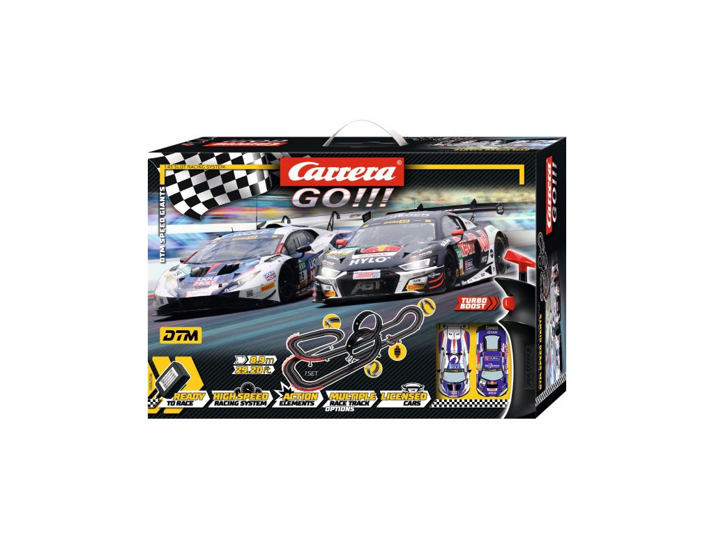 Autodráha Carrera GO!!! dlouhá 8,9m s auty GT3 Audi R8 LMS a Lamborghini Huracán, obsahuje looping, klopenou zatáčku, kolmou stěnu, rovinky, zatáčky, díl s počítadlem kol a další díly. Můžete si sestavit další různé trati podle své fantazie. Nejdelší set GO!!!Délka trati: 8,9 m