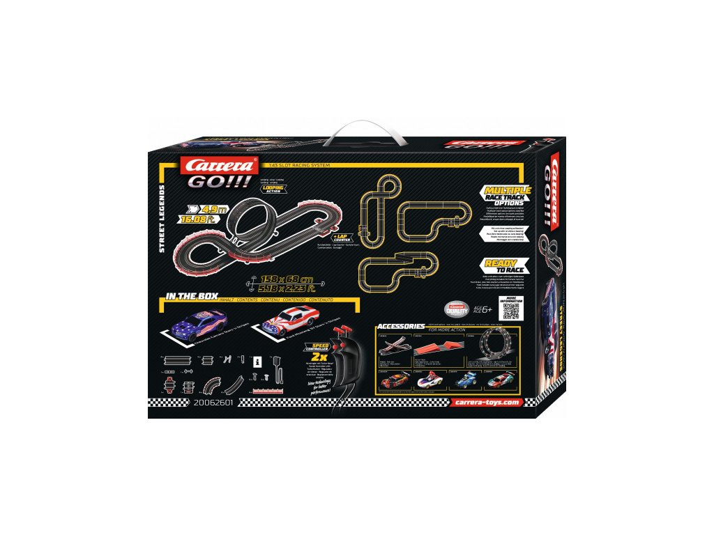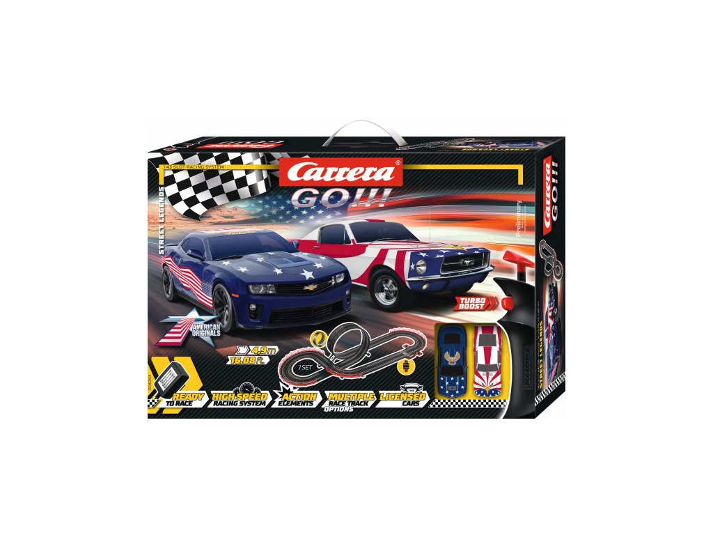 Autodráha Carrera GO!!! dlouhá 4,9m s auty Ford Mustang ´67 a Chevrolet Camaro, obsahuje, přemostění, rovinky, zatáčky, looping, díl s počítadlem kol a další díly. Můžete si sestavit další různé trati podle své fantazie.Délka trati: 4,9 m