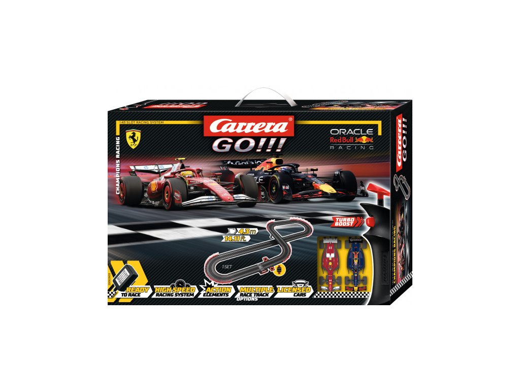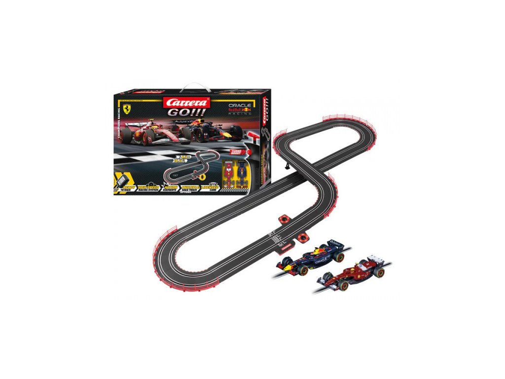 Autodráha Carrera GO!!! dlouhá 4,3m s auty F1 Ferrari a Red Bull, obsahuje, přemostění, rovinky, zatáčky, díl s počítadlem kol a další díly. Můžete si sestavit další různé trati podle své fantazie.Délka trati: 4,3 m