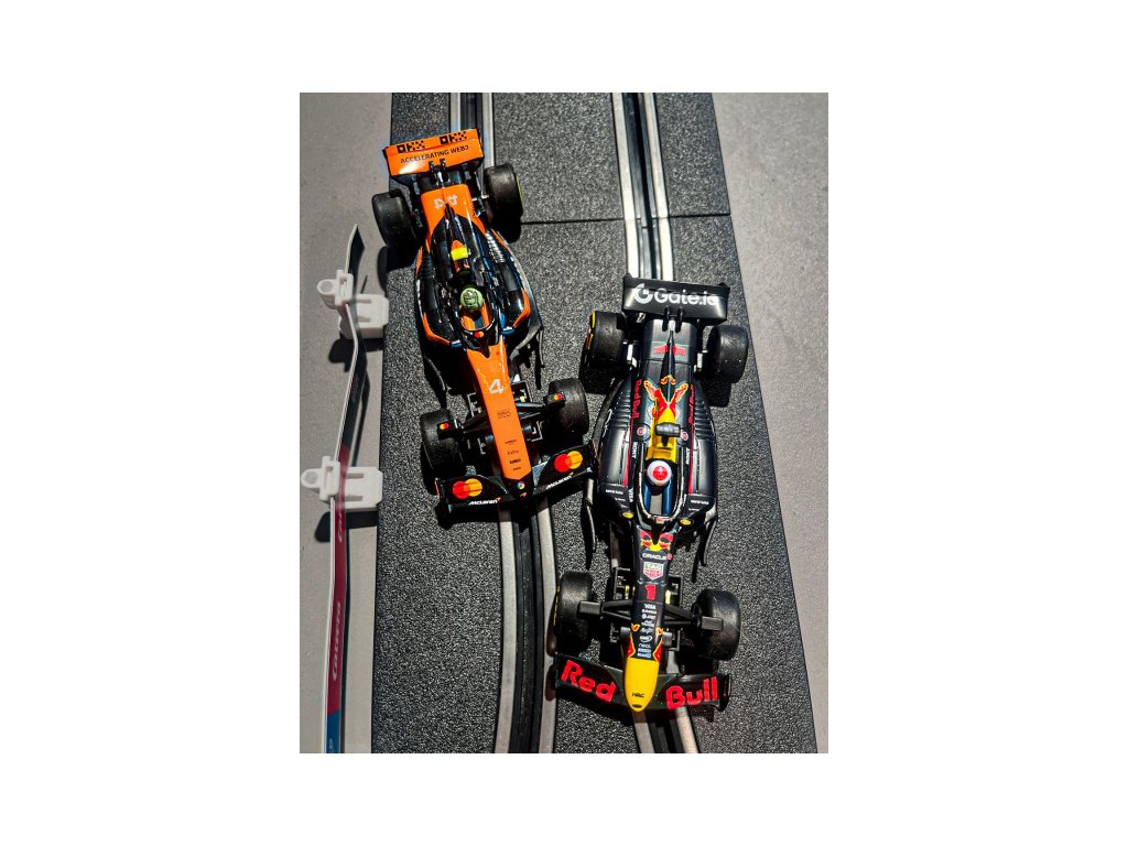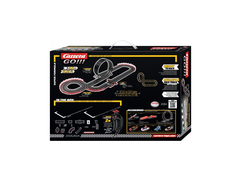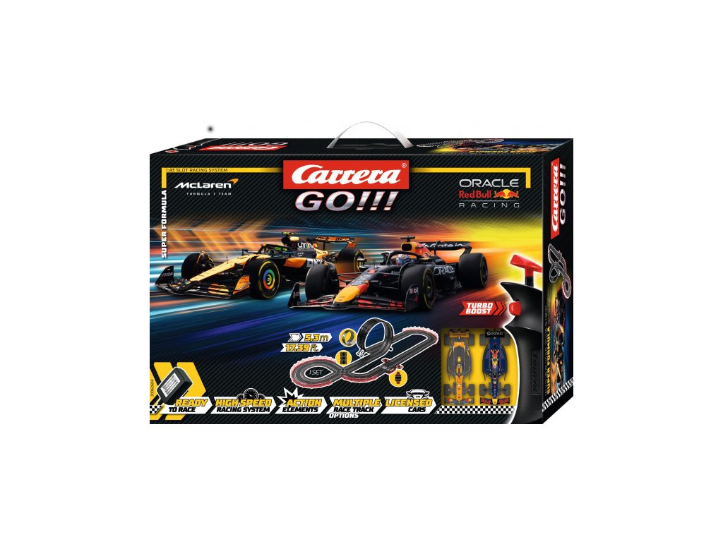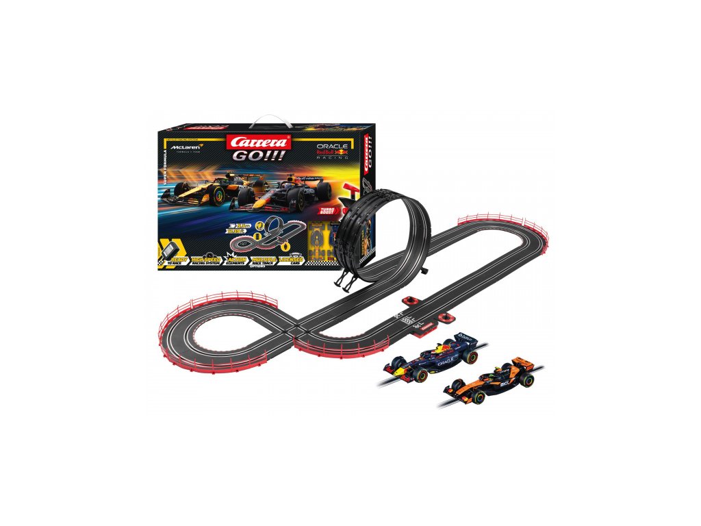 Autodráha Carrera GO!!! dlouhá 5,3m s auty F1 Red Bull a McLaren, obsahuje, křižovatku, rovinky, zatáčky, looping, díl s počítadlem kol a další díly. Můžete si sestavit další různé trati podle své fantazie.Délka trati: 5,3 m