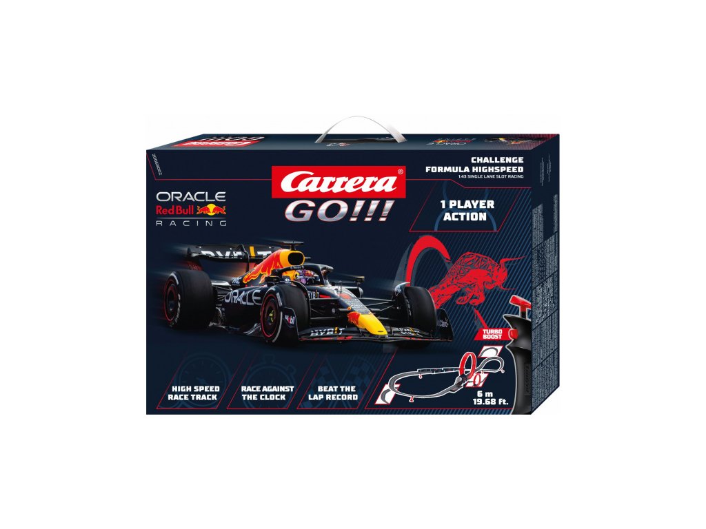 Autodráha Carrera GO!!! dlouhá 6m s autem Formula 1 Red Bull, obsahuje looping, klopenou zatáčku, kolmou stěnu, rovinky, zatáčky, díl s počítadlem kol a další díly. Můžete si sestavit další různé trati podle své fantazie. Jedna dráha, jedno auto, jeden ovladač.Délka trati: 6 m