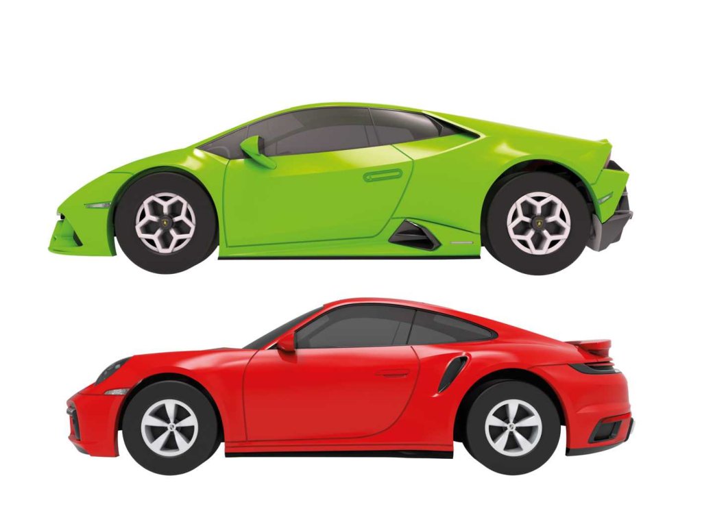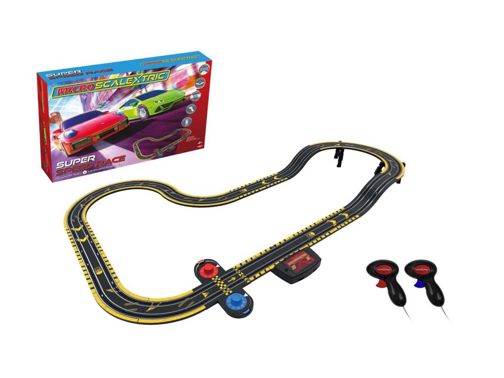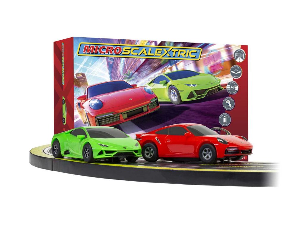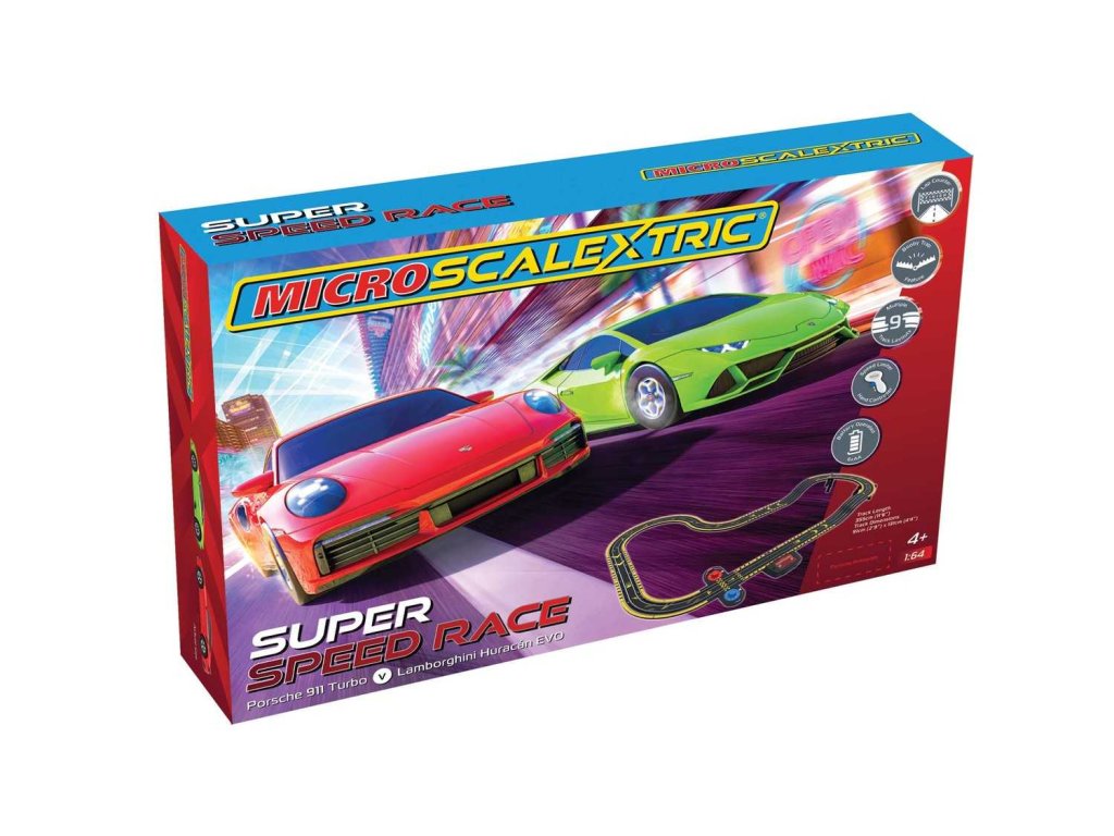 Na této autodráze Micro Scalextric Super Speed Race Set probíhá nelítostná honička. Kdo vyhraje – červené Porsche 911 Turbo, nebo zářivě zelené Lamboghini Huracán EVO? Tato závodní sada obsahuje vše, co potřebuješ k závodění Scalextric, včetně superaut, napájecí základny na baterie (baterie nejsou součástí balení), 2 jednoduchých ručních ovladačů s omezovačem rychlosti a více než 3,5 metru dlouhé dráhy, ze které dokážete vytvořit 9 jedinečných závodních okruhů a která obsahuje také nástrahu, počítadlo kol a rychlostní rampu.