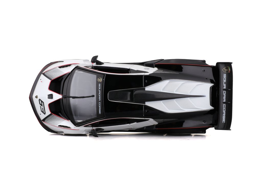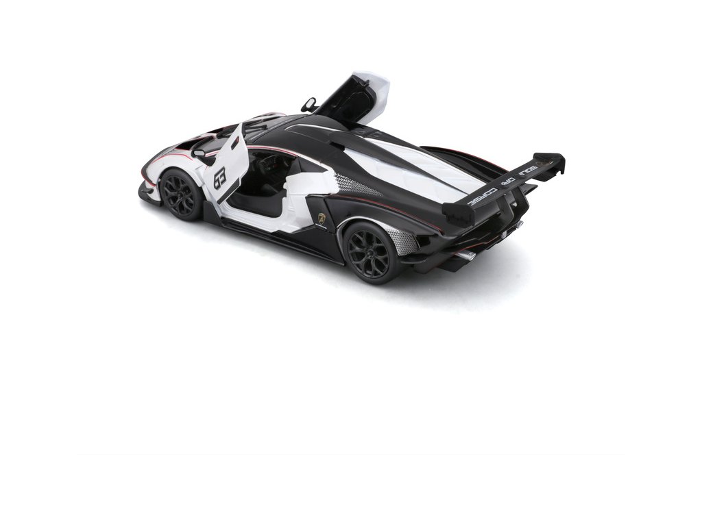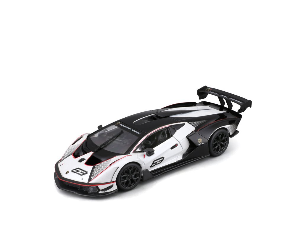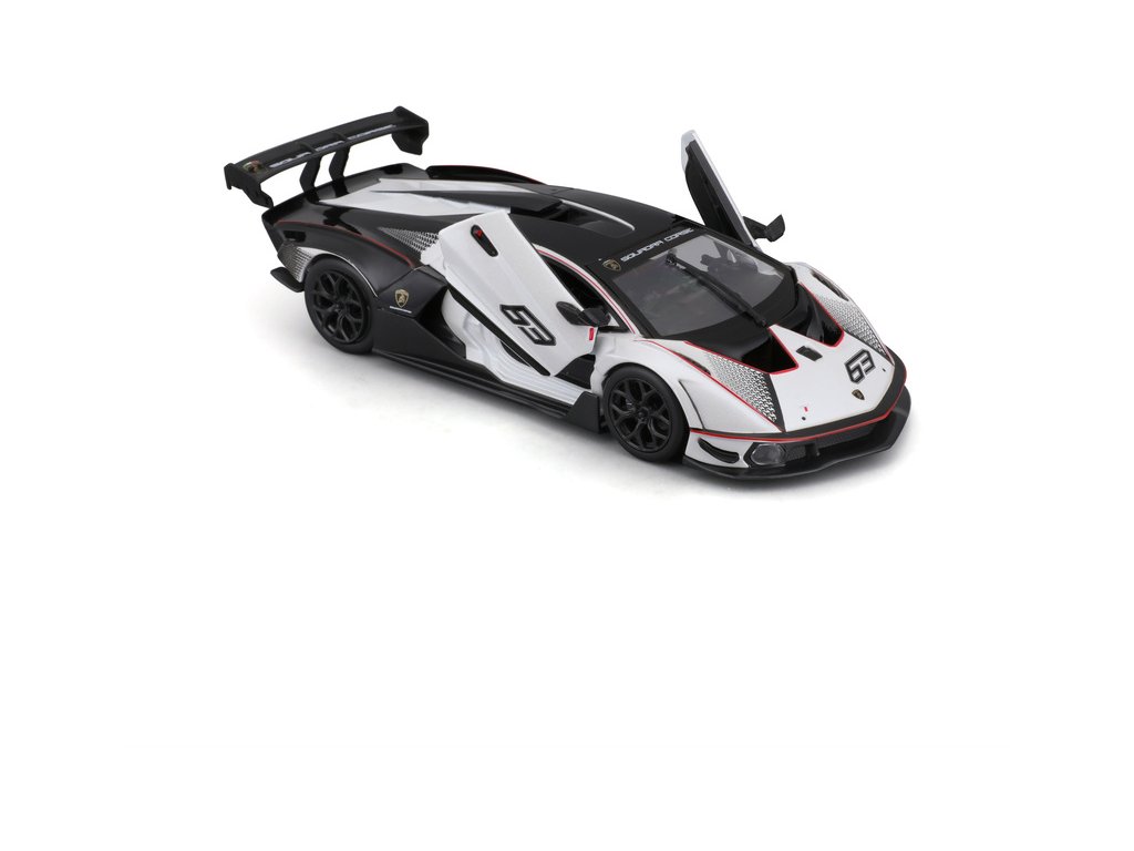 Kovový model auta 1:24 Bburago 18-28017 Lamborghini Essenza SCV12 nejen pro sběratele. Model je v černé a bílé barvě se závodním číslem.