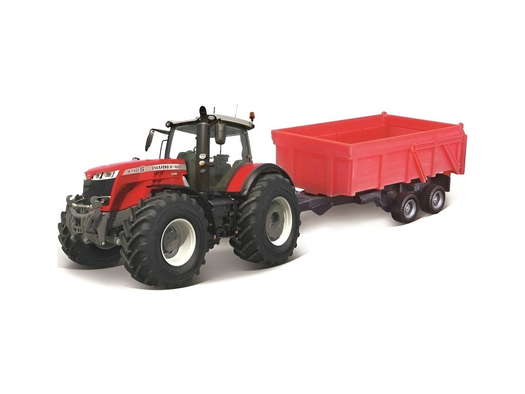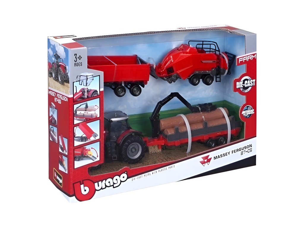 Bburago model - Traktor Massey Ferguson 8740S s doplňky je vyroben z plastových dílů. Model je na setrvačník, má zadní závěs pro připojení vlečky a je v detailním provedení.