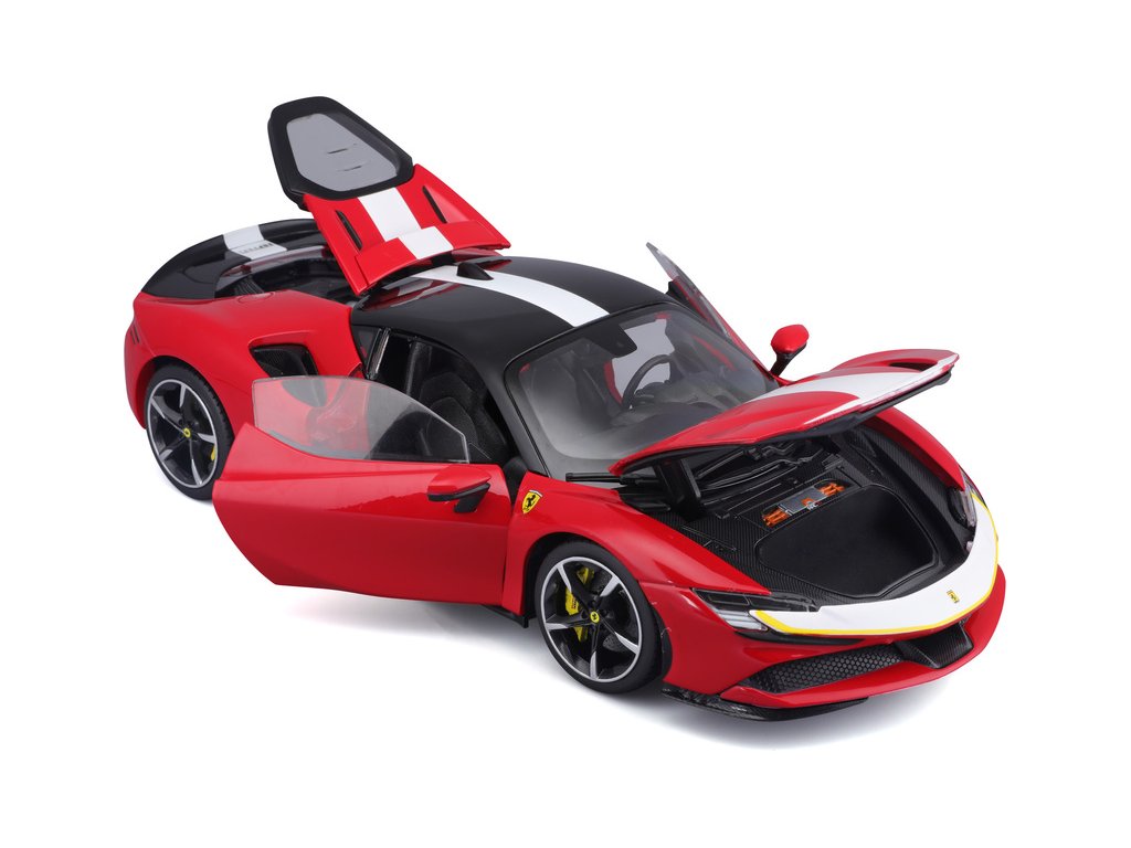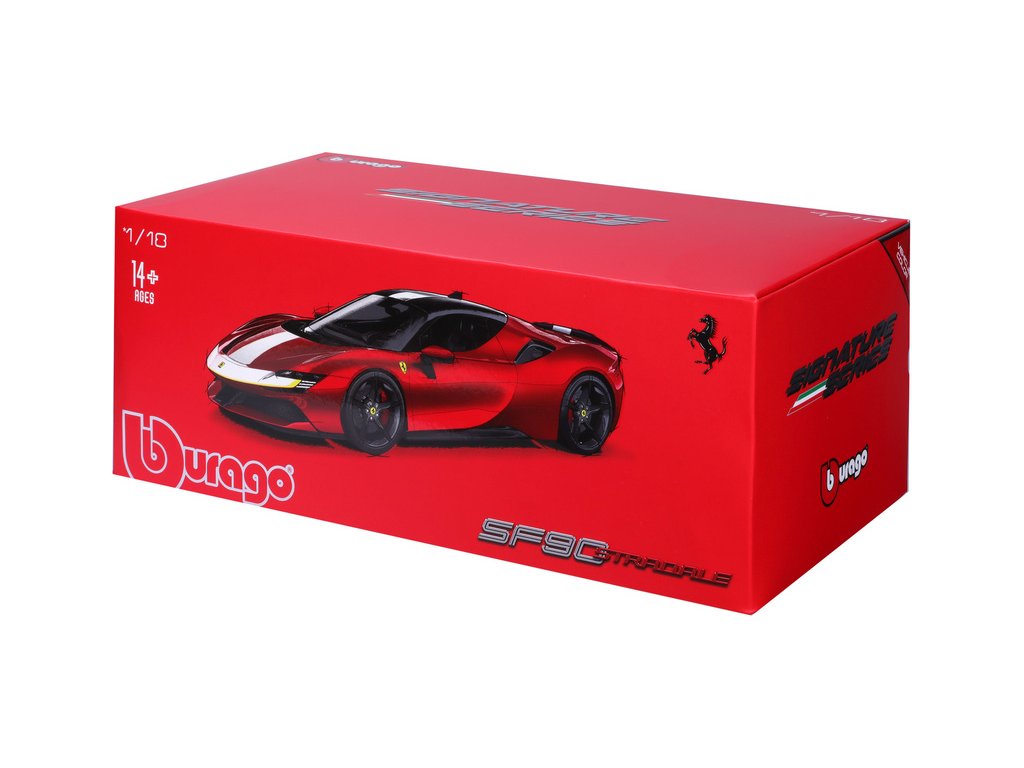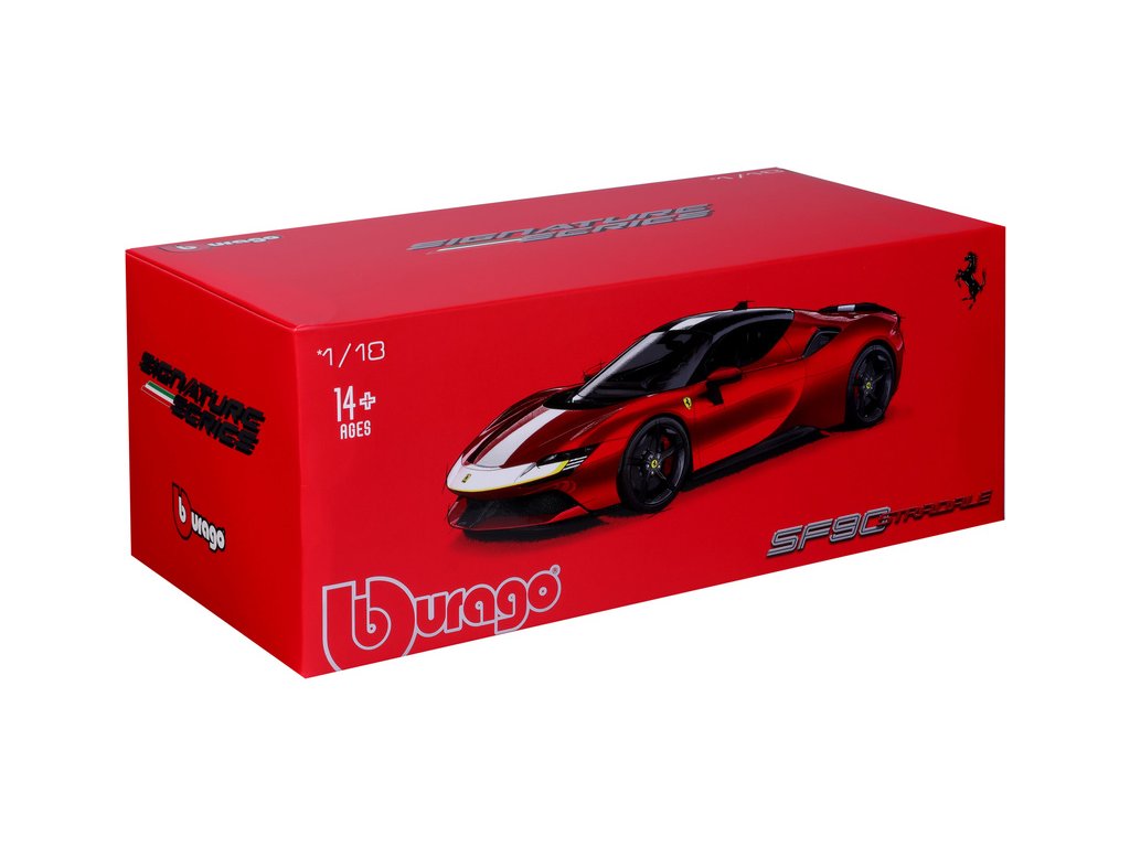 Kovový model auta Bburago 18-16911 Signature - Ferrari SF90 Stradale Assetto Fiorano v měřítku 1:18 nejen pro sběratele. Model má otevírací dveře a kapotu, odpružené nápravy, natáčení kol volantem. Model je ve špičkové kvalitě Signature Series. Barva modelu je červená.