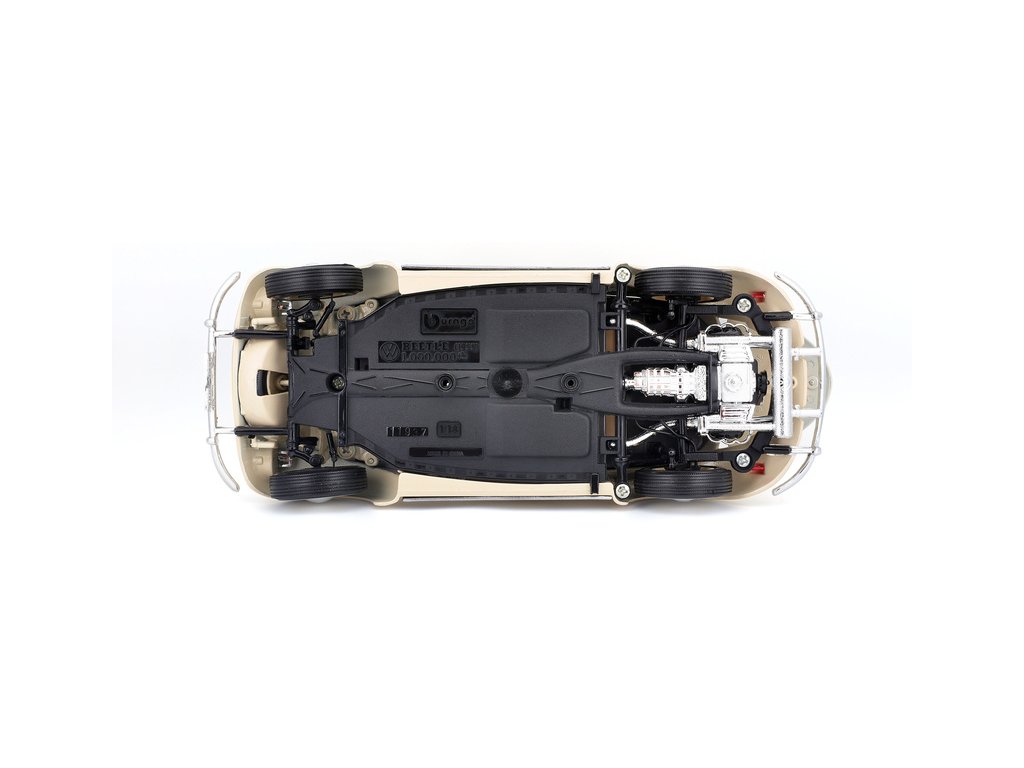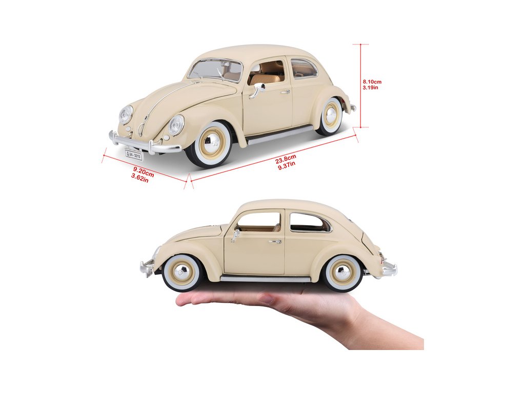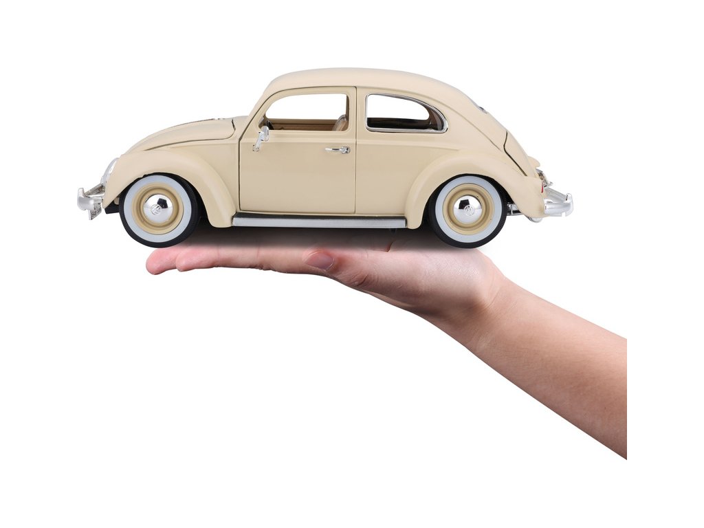 Kovový model Bburago Volkswagen Kafer Beetle 1955 v měřítku 1:18 nejen pro sběratele. Detailní provedení, přívětivá cena, barva béžová, délka přibližně 24 cm.