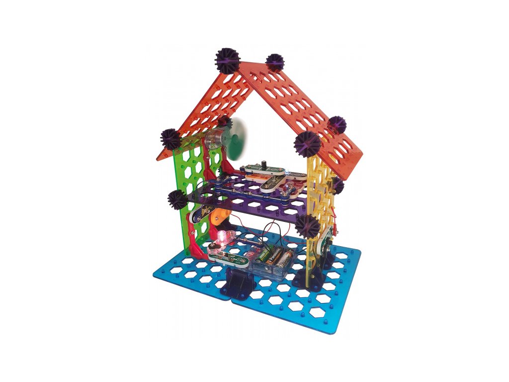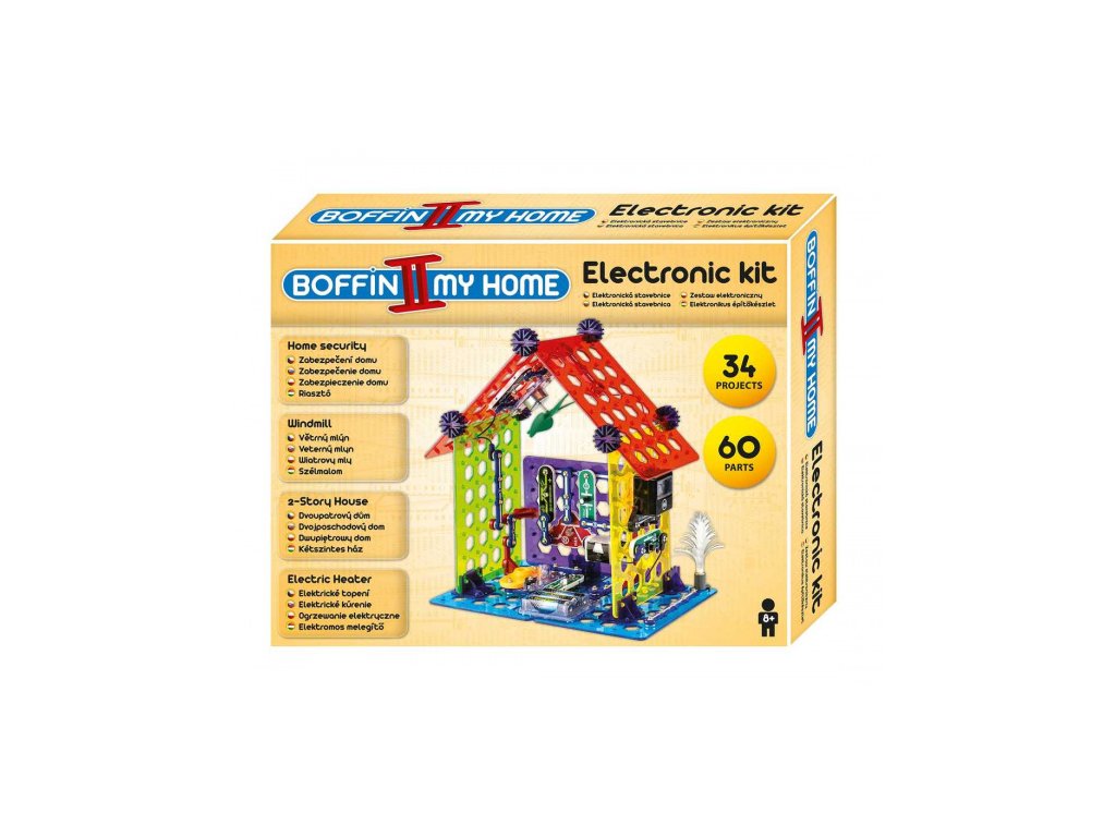 Se stavebnicí Boffin II Můj Dům se dozvíte, jak elektřina přichází do domů, sestavíte si světelné čidlo, elektrické topení, dvoupatrový dům, větrný mlýn a další projekty. Stavebnice obsahuje 60 součástek, z nichž lze postavit projekty: