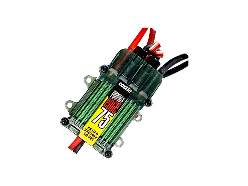 Špičkový regulátor Phoenix Edge 75 od Castle Creations je určen pro vrtulníky velikosti 500 nebo do letadel o velikosti .42 až .52. Napájení 2 až 8 čl. LiPol akumulátorů, max. trvalý proud 75 A. Pro dobrý obvod tepla vznikajícího v tranzistorech je regulátor po svém obvodu vybaven velkým chladičem.