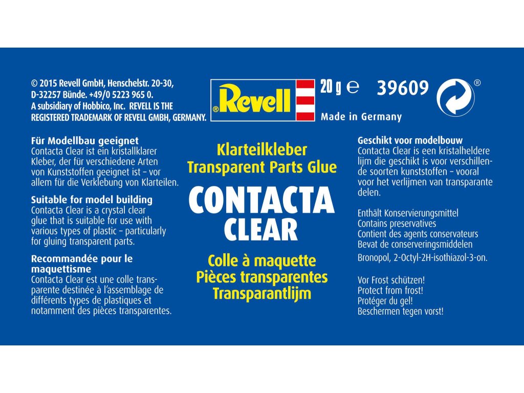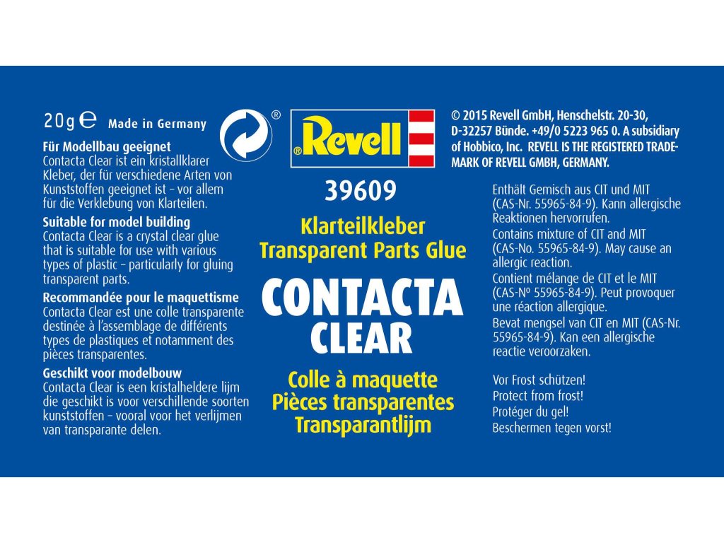 Revell Contacta Clear je speciální průzračné lepidlo ideální pro stavění modelů. Jedná se o lepidlo na vodní bázi, které se hodí na různé druhy plastů. I po zaschnutí zůstává velmi čiré a průhledné, takže může být využito zejména pro lepení průhledných částí modelů, jako jsou okna a kryty pilotních kabin. Pomocí štětce ukrytého ve víčku lahvičky lze jednoduše nanést tenkou vrstvu na obě strany určené k přilepení.Návod k použití: Naneste tenkou vrstvu lepidla Contacta Clear na oba lepené dílky. Nechte vyschnout na vzduchu cca 5-10 minut, přičemž lepidlo musí být stále lepkavé. Poté spojte oba dílky příslušnými stranami k sobě a chvíli držte pomocí rukou.