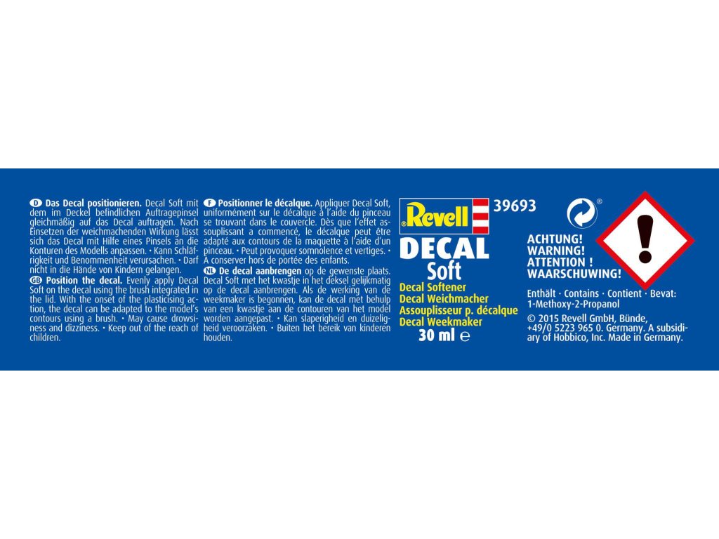 Změkčovač Revell Decal Soft je výborným pomocníkem modeláře při lepení obtisků/potisků na téměř hotové modely. Poté, co jste potisk umístili na žádoucí nabarvenou část modelu, rovnoměrně na něj naneste změkčovač za pomoci štětce umístěného ve víčku lahvičky. Díky jeho působení je pak možné tvrdým štětcem potisk dokonale přizpůsobit obrysům modelu.