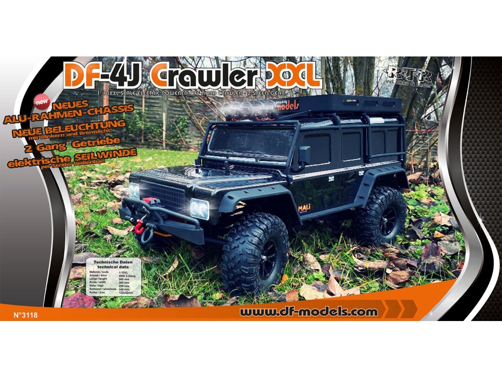 DF-4J XXL Crawler je nyní vybaven již v základu hliníkovými výztuhami pro maximální pevnost. Oproti předchůdci má také ve standardu směrová a brzdová světla. Dále je vybaven stejnosměrným 60-ti závitovým motorem a s vysokým točivým momentem. Model má super měkké pneumatiky, díky kterým perfektně doslova obejme každou překážku. Diferenciály modelu jsou uzavřené a speciální elektronický regulátor typu crawler, má funkci zastavení při sjíždění ze svahu. Úhel nájezdu na překážku je až 90%, v závislosti na terénu. Elektronika je v modelu chráněna proti stříkající vodě, takže vlhkost není problém. Pevné nápravy, hliníkový rám, extrémní odpružení a mnohem více nabízejí nové modely řady DF-4J XXL! Vstupte do velkého světa "pomalých" vozidel! Model lze vylepšit řadou dalších vychytávek, jako je řízení všech čtyř kol, či tuningovými ALU hliníkovými díly. S modelem lze dosáhnout doby jízdy přes 60 minut. Převodové stupně (řazení) lze ovládat z vysílače. Vysílač má možnost díky funkci dual rate nastavit maximální rychlost 0-100%.