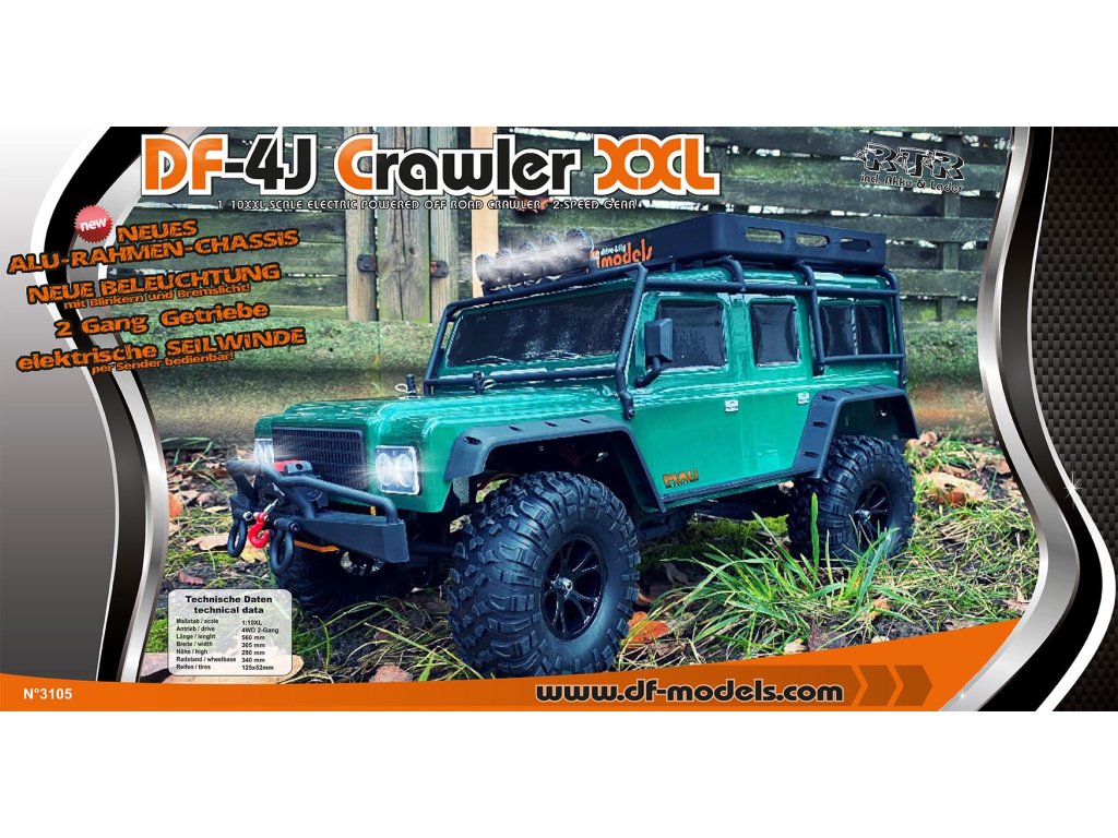 DF-4J XXL Crawler je nyní vybaven již v základu hliníkovými výztuhami pro maximální pevnost. Oproti předchůdci má také ve standardu směrová a brzdová světla. Dále je vybaven stejnosměrným 60-ti závitovým motorem a s vysokým točivým momentem. Model má super měkké pneumatiky, díky kterým perfektně doslova obejme každou překážku. Diferenciály modelu jsou uzavřené a speciální elektronický regulátor typu crawler, má funkci zastavení při sjíždění ze svahu. Úhel nájezdu na překážku je až 90%, v závislosti na terénu. Elektronika je v modelu chráněna proti stříkající vodě, takže vlhkost není problém. Pevné nápravy, hliníkový rám, extrémní odpružení a mnohem více nabízejí nové modely řady DF-4J XXL! Vstupte do velkého světa "pomalých" vozidel! Model lze vylepšit řadou dalších vychytávek, jako je řízení všech čtyř kol, či tuningovými ALU hliníkovými díly. S modelem lze dosáhnout doby jízdy přes 60 minut. Převodové stupně (řazení) lze ovládat z vysílače. Vysílač má možnost díky funkci dual rate nastavit maximální rychlost 0-100%.