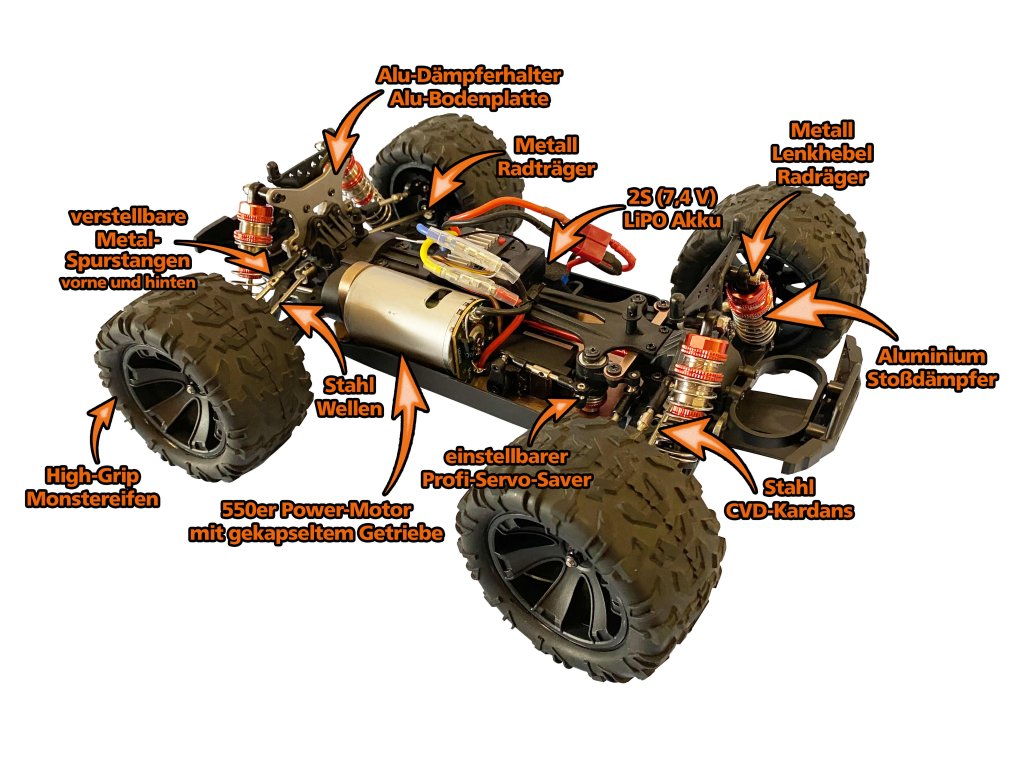4 WD * PLNĚ PROPORCIONÁLNÍ * 2,4 GHz * MAX. RYCHLOST AŽ 60 KM/H * CELOHLINÍKOVÝ PODVOZEK * OLEJOVÉ ALU TLUMIČE * PŘEDNÍ CVD POLOOSY * SERVO SAVER * RTR