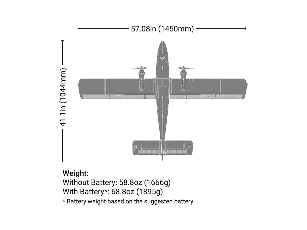 RC model letadla je vyroben ve formách z Elaporu a má hotové zbarvení. Konstrukce obsahuje potřebné zesílení, křídlo má polosymetriký profil. Gondoly jsou pro vyšší tuhost podepřeny vzpěrami k hlavnímu podvozku. Létat je možné z široké škály povrchů od letišť, parků a sportovišť s tvrdým nebo travnatým povrchem, až po rybníky či jezera v případě použití plováků (jsou obsahem balení). Serva jsou z výroby instalována a pro servo směrovky, které ovládá příďové kolo, jsou použity kovové převody.