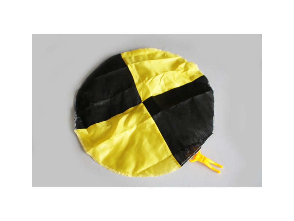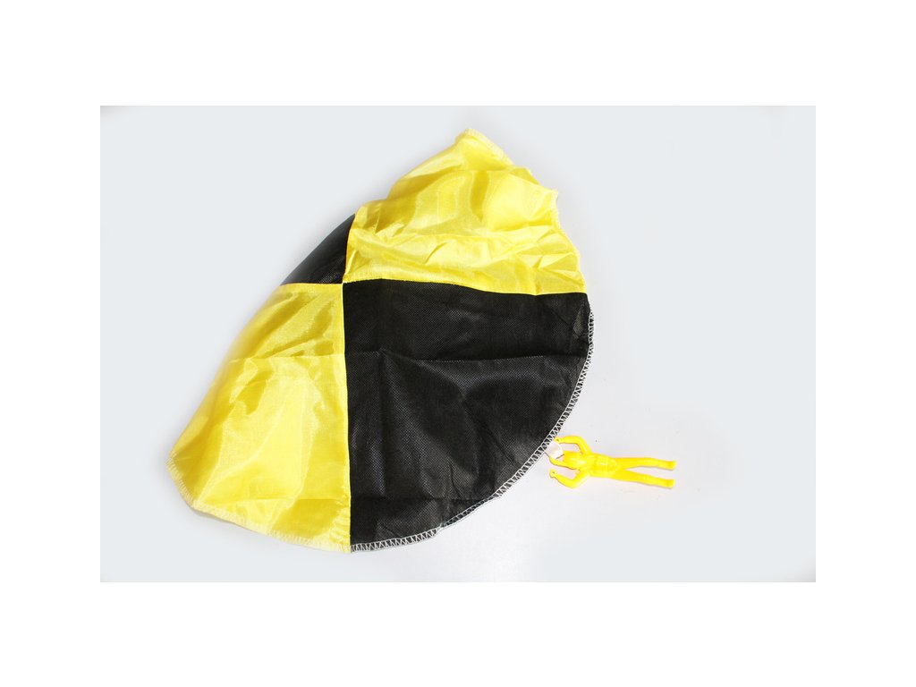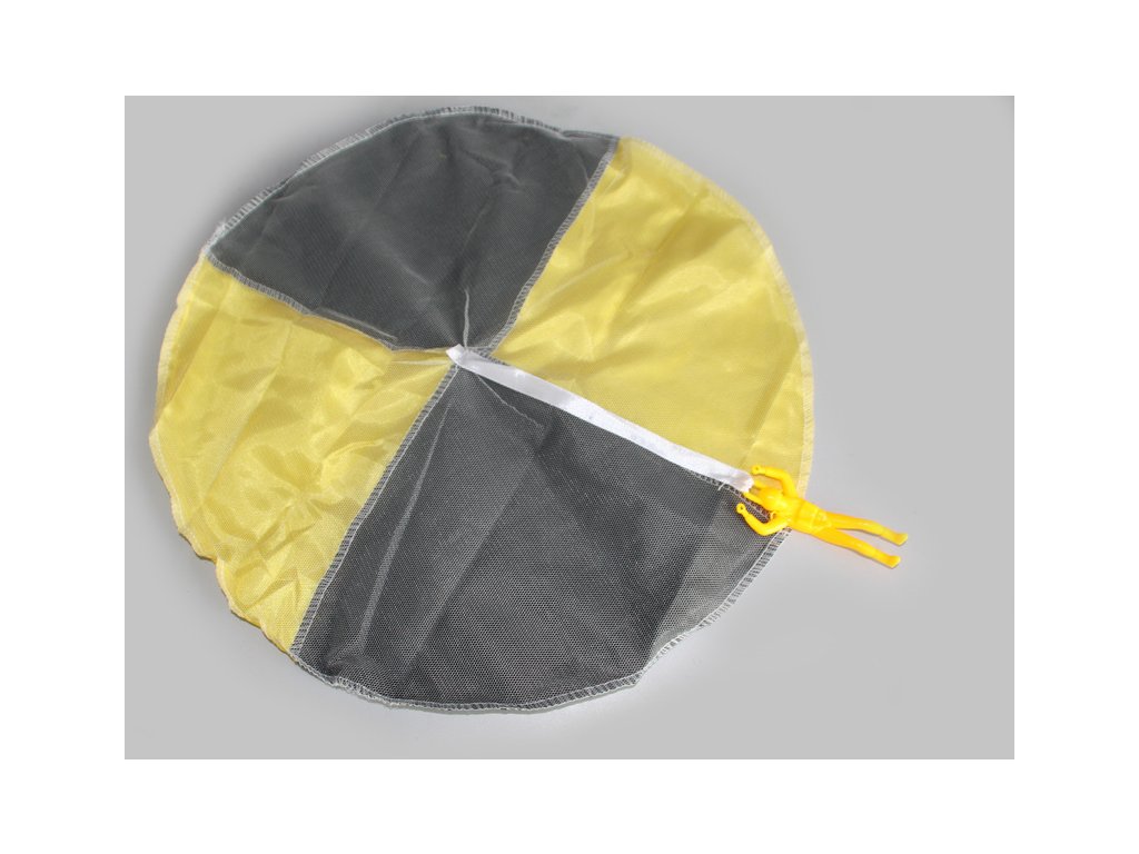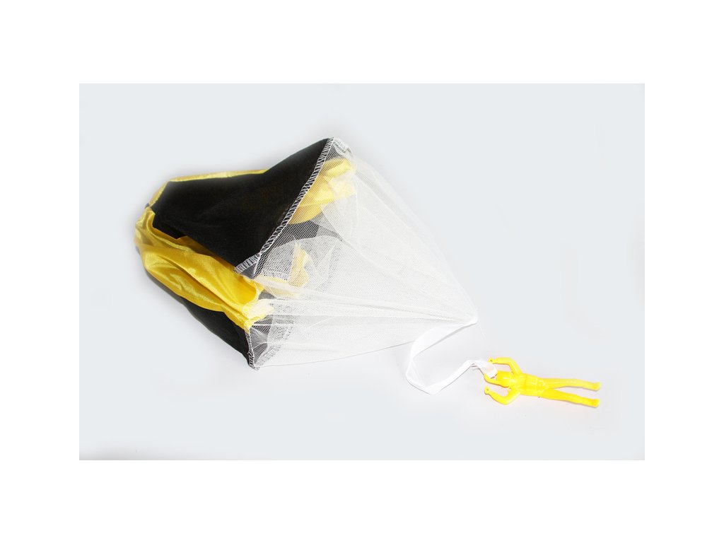Padák je vyroben z výsečí černé - netkaná textilie a barevné - silonová tkanina. Na spodní straně je přišita síťovina, fugurka je zavěšena na stužce. Výhodou je to, že padák se nemůže zamotat a vždy se otevře.