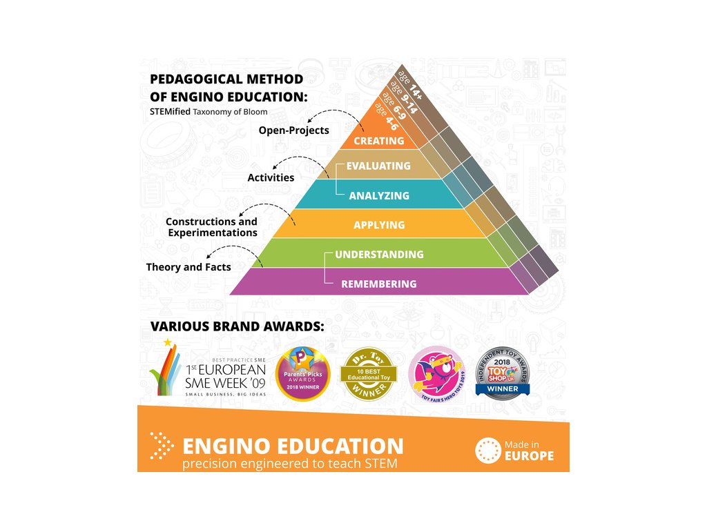 Engino pomáhá dětem rozvíjet kritické myšlení, prostorovou představivost a koordinaci ruka-oko již od 1.5 roku. Učí je spolupracovat, hledat řešení problémů a aplikovat teorii v praxi. Pro pedagogy i rodiče Engino nabízí kompletní výukový systém STEM, který pokrývá širokou škálu vědeckých principů a podporuje učení prostřednictvím hraní. Engino se pyšní bezpečností a ekologickými hledisky.
