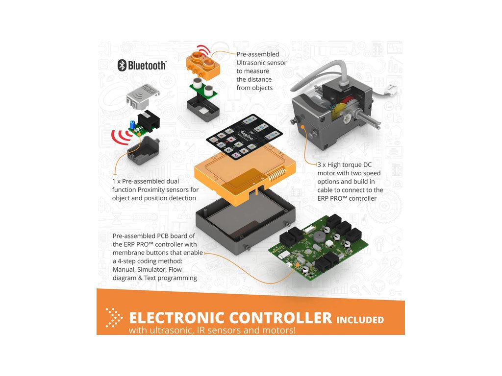 Engino Coding Lab erp mini je robotické vozidlo s wi-fi a BT konektivitou, které má pokročilé funkce a je dodáváno s ručně programovatelným ovladačem, který lze také připojit pomocí bluetooth k chytrým zařízením nebo pomocí USB portu k počítači.