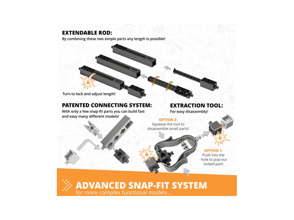 - Inovativní design: Patentovaná zaklapávací konektivita a vícesměrné otočné čepy umožňují stavět z různých úhlů až ze 6-ti stran současně.