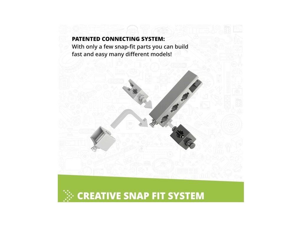 - Inovativní design: Patentovaná zaklapávací konektivita a vícesměrné otočné čepy umožňují stavět z různých úhlů až ze 6-ti stran současně.