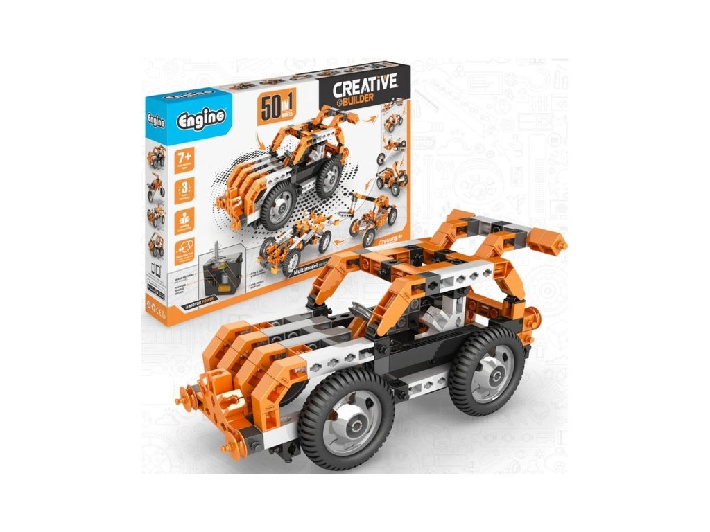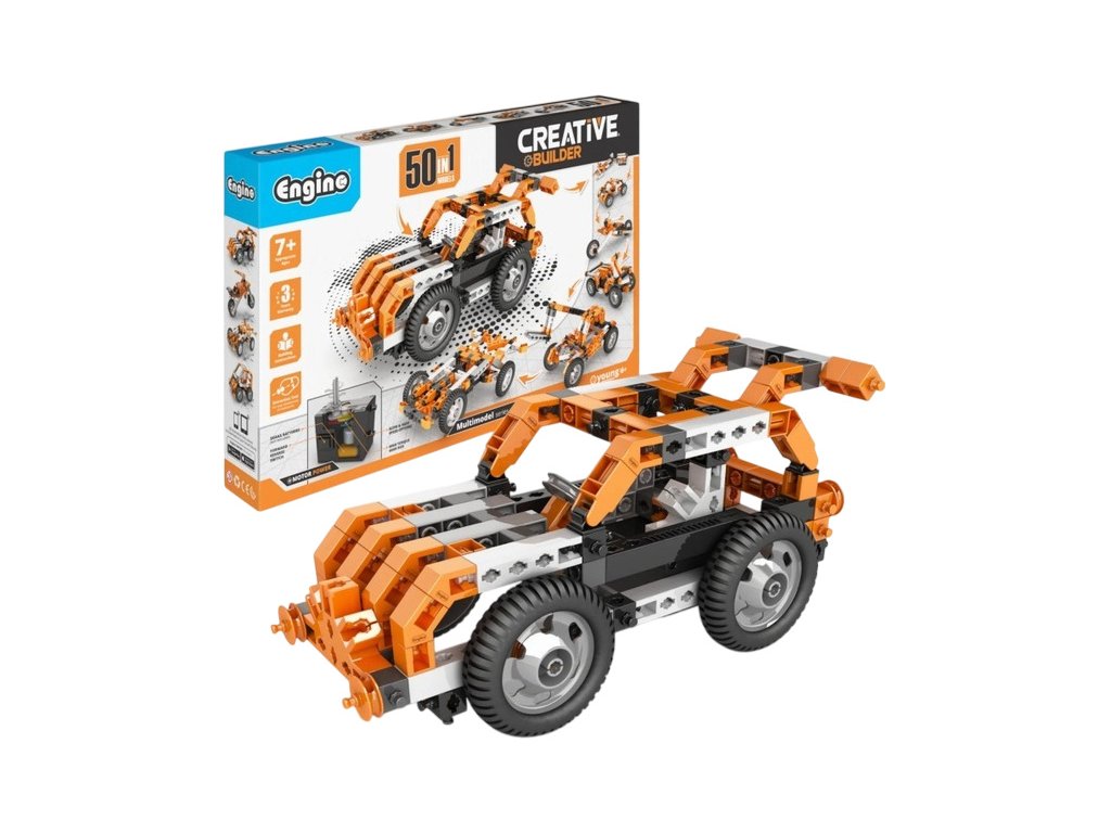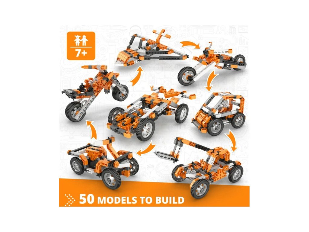Engino Inventor 50 modelů je stavebnice s možností sestavení více modelů. Obsahuje elektromotor, který vaše modely rozpohybuje. Je možné sestavit úžasná vozidla jako formuli, dragster, off-road, nebo choper jeřáb, či nakladač. Věk 7+. Set obsahuje tištěný návod na 4 modely, návody na všech 30 modelů ENGINO jsou zdarma dostupné na stránkách výrobce. Návody a 3D instrukce si můžete prohlížet v PC, tabletu nebo chytrém telefonu.