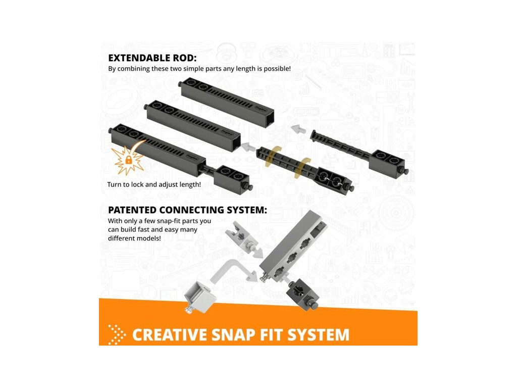 - Inovativní design: Patentovaná zaklapávací konektivita a vícesměrné otočné čepy umožňují stavět z různých úhlů až ze 6-ti stran současně.