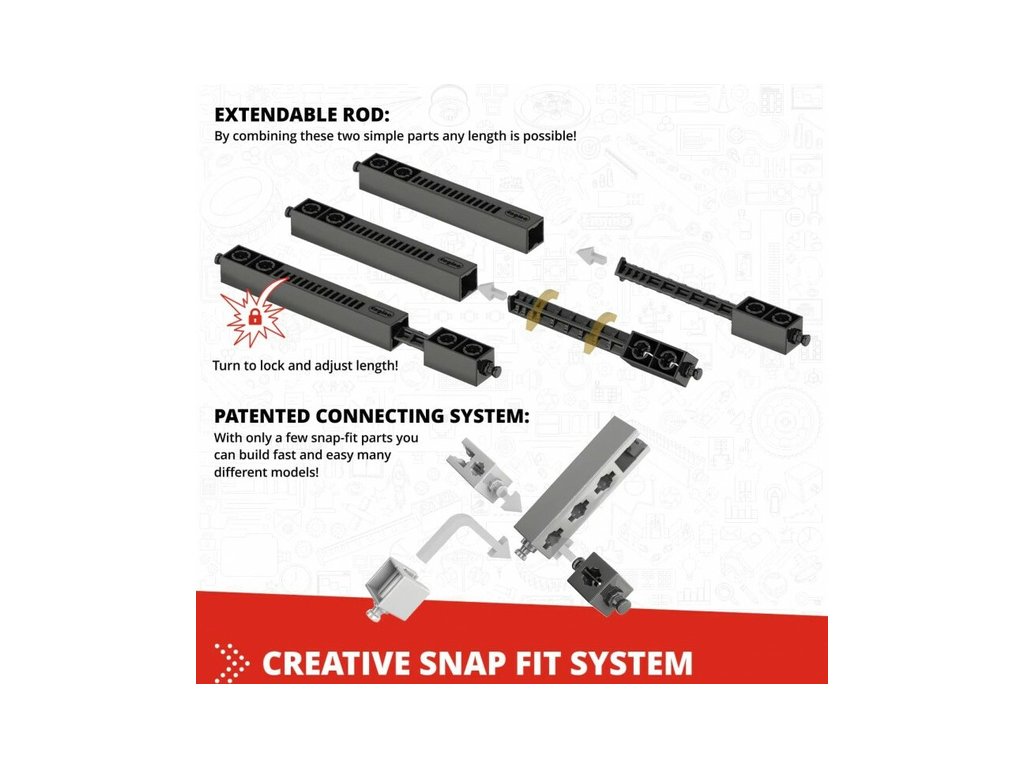 - Inovativní design: Patentovaná zaklapávací konektivita a vícesměrné otočné čepy umožňují stavět z různých úhlů až ze 6-ti stran současně.