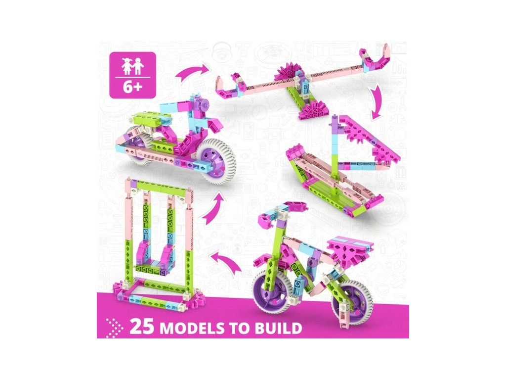 Stavebnice Engino Creative Builder Designer 25 modelů, určená pro dívky, která je inspiruje ke kreativnímu hraní a zábavnou formou budou objevovat úžasný svět vědy, techniky a inženýrství. Sestavte 25 unikátních modelů pomocí návodu jako je kolo, houpačka nebo lodička. Věk 6+.